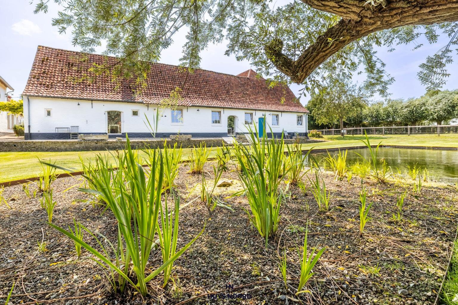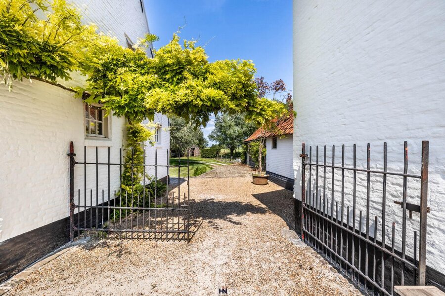 Via de private oprijlaan bereikt u het domein met de historische hoevewoning, de gerenoveerde schuur (175 m2), prachtig aangelegde zwemvijver en bijgebouwen. (elk 100 m2)