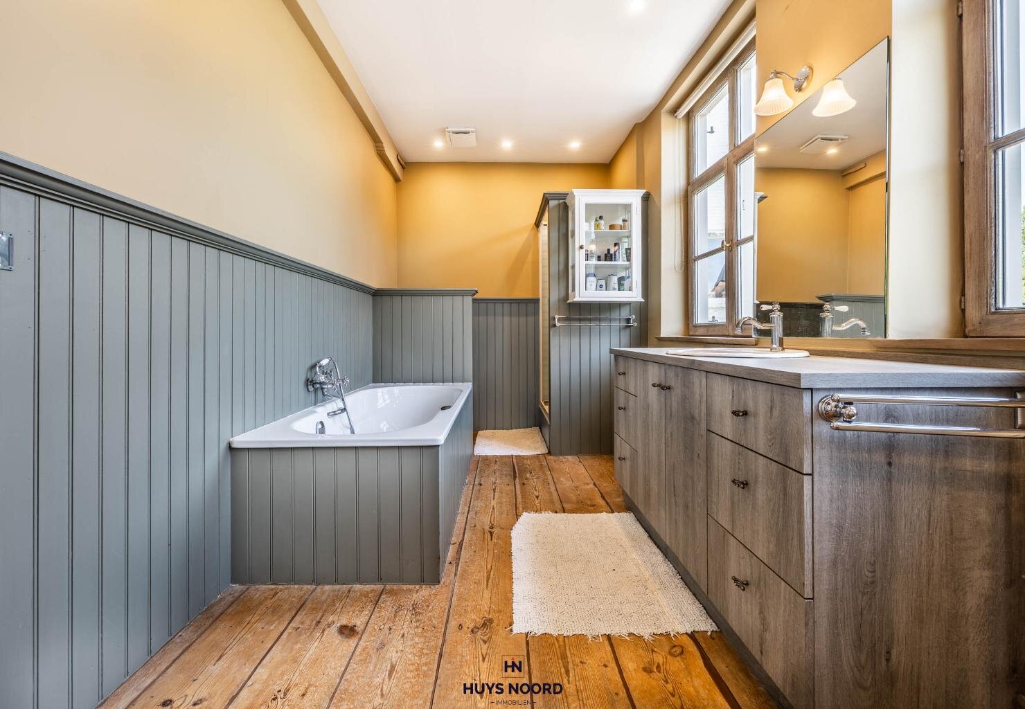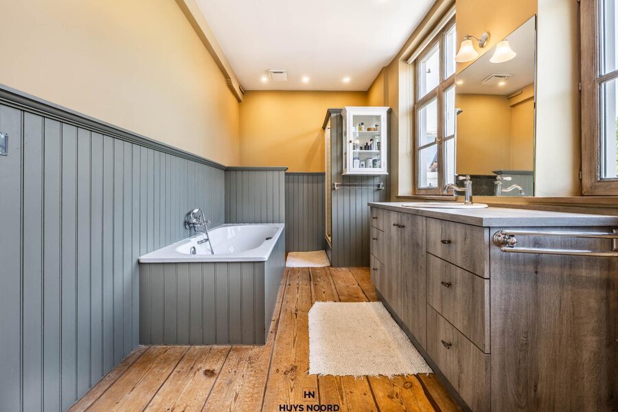 Aansluitend de en-suite badkamer voorzien van ligbad, douche en wastafelmeubel met prachtig open zicht.