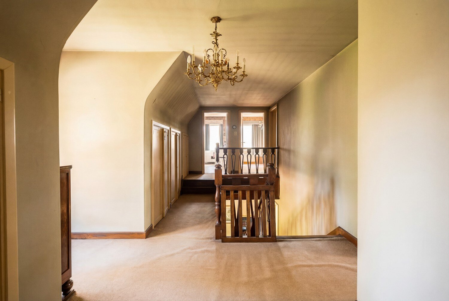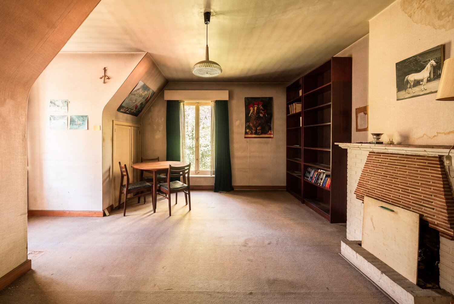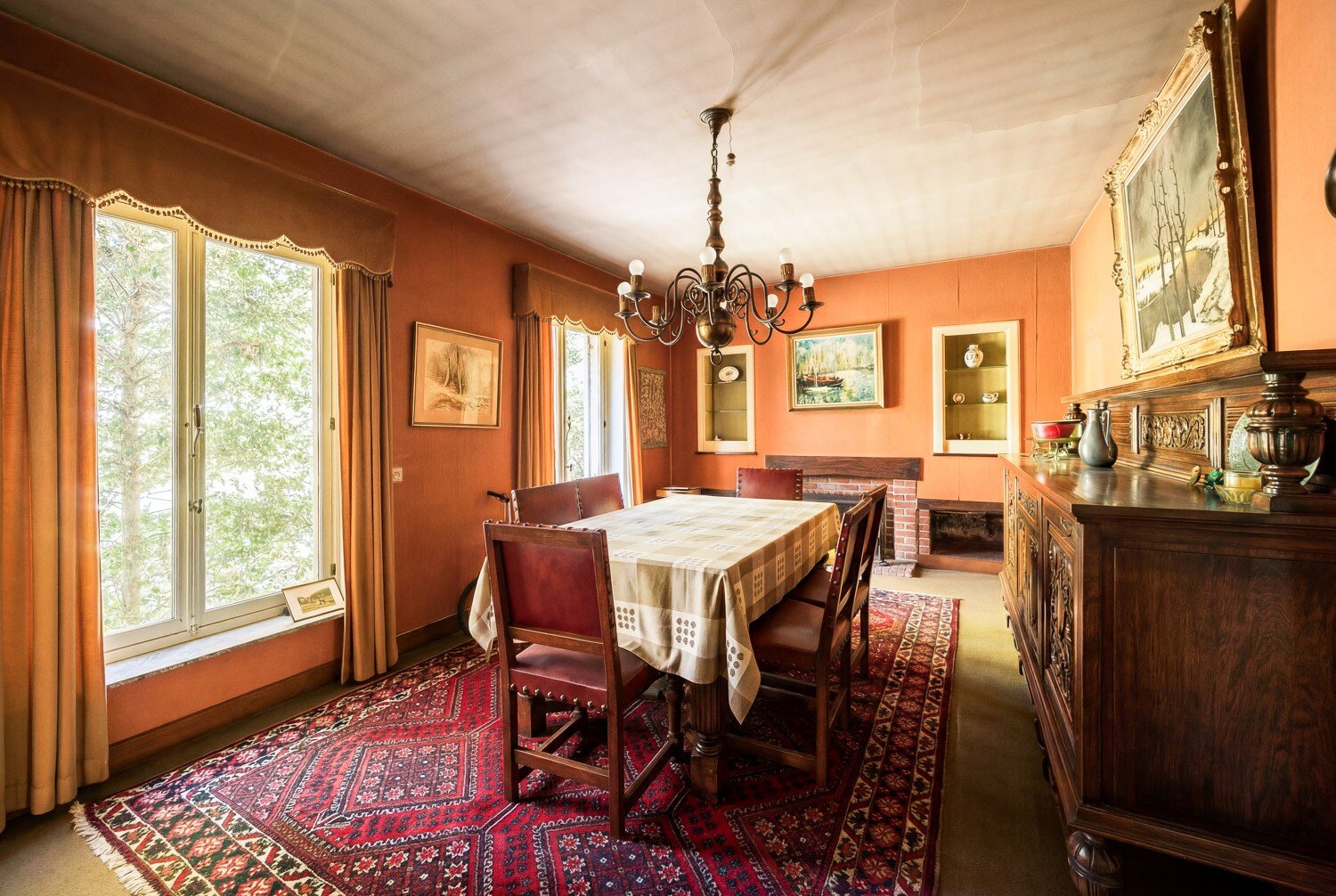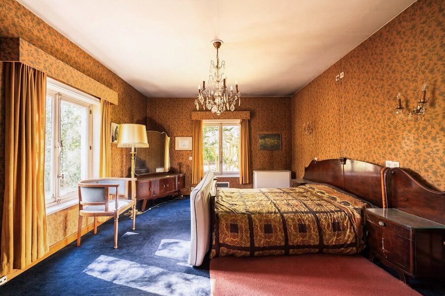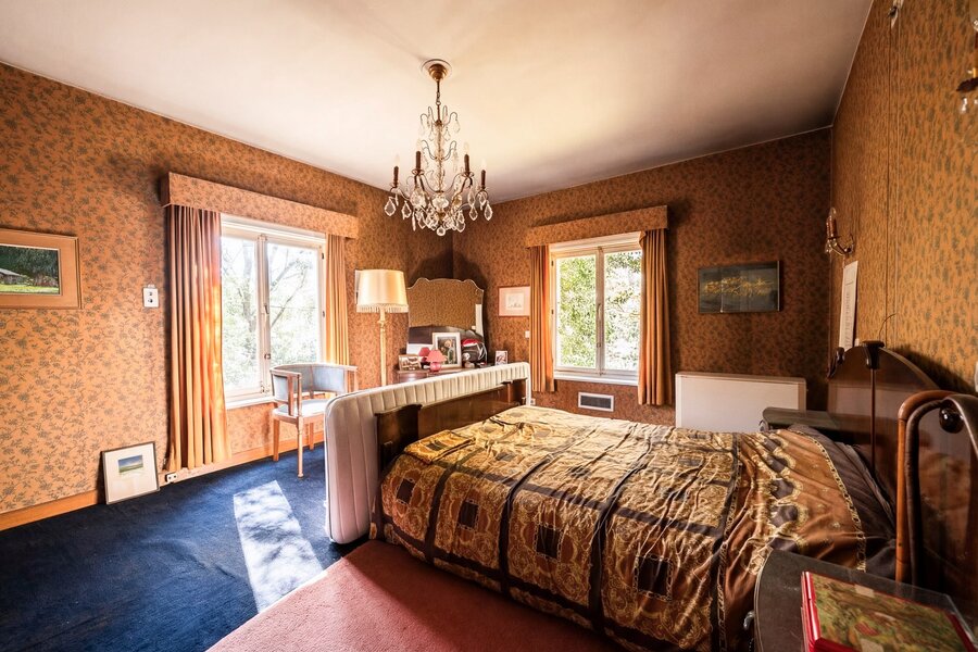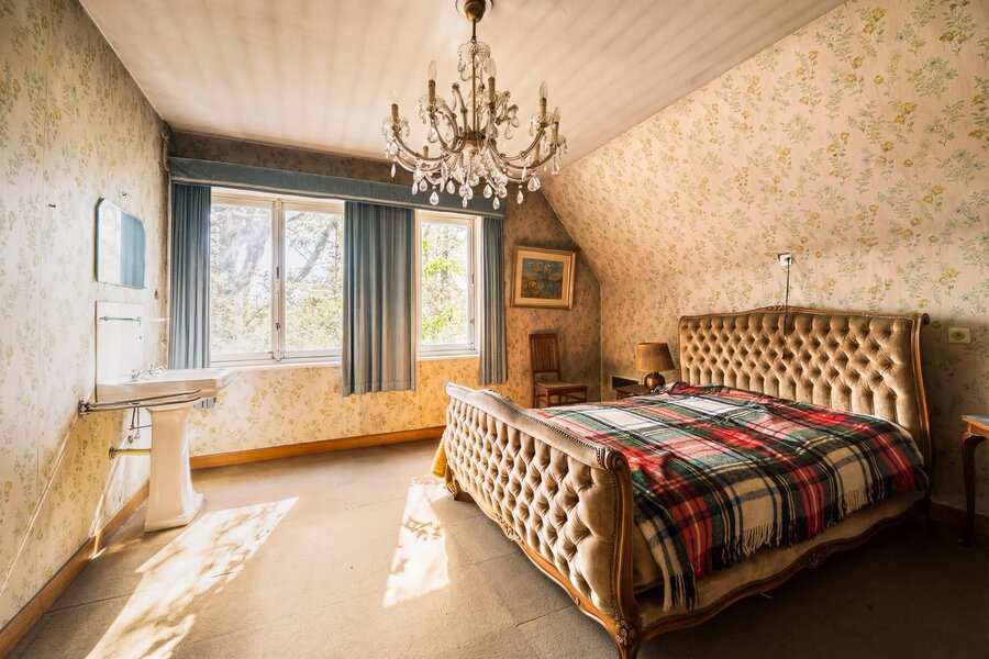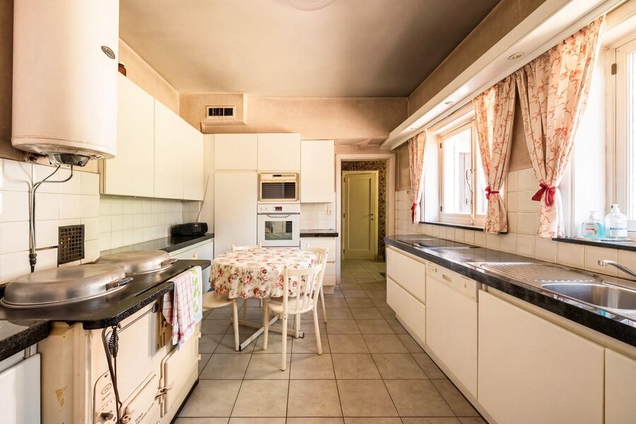Binnenin ontvouwt zich een klassieke indeling met een inkomhal die toegang geeft tot de living met open haard en een afzonderlijk eetgedeelte, beide badend in natuurlijk licht en met een subliem zicht op het groen. Verder bevinden zich op het gelijkvloers een keuken, berging, bureau en een master bedroom met ensuite badkamer, waardoor wonen op het gelijkvloers perfect mogelijk is.