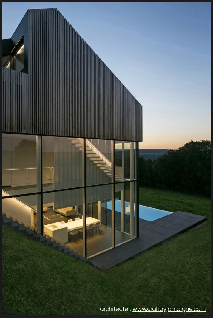 Een zeldzame eigendom die hedendaagse esthetiek, energieprestaties en een bevoorrechte natuurlijke ligging harmonieus verenigt — ideaal als hoofdverblijf of als exclusieve tweede verblijfplaats. (copyright pictures - architect : www.crahayjamaigne.com)