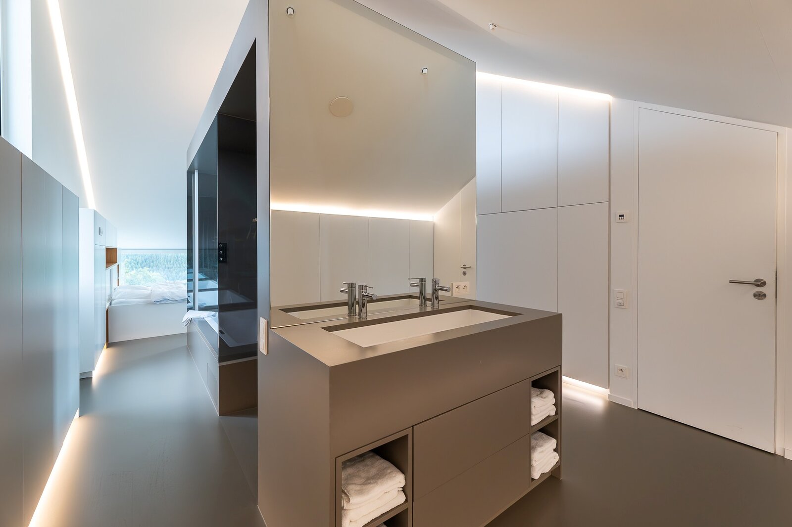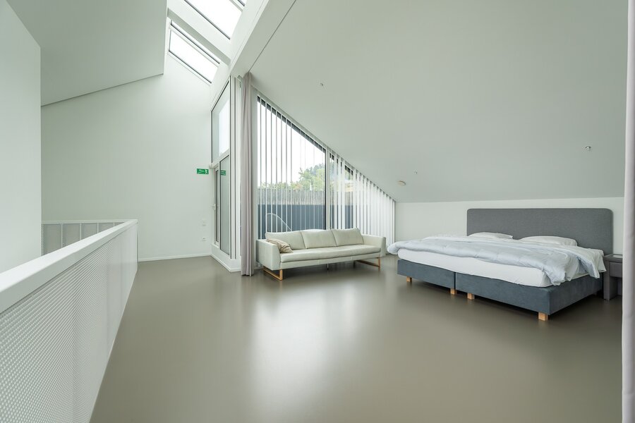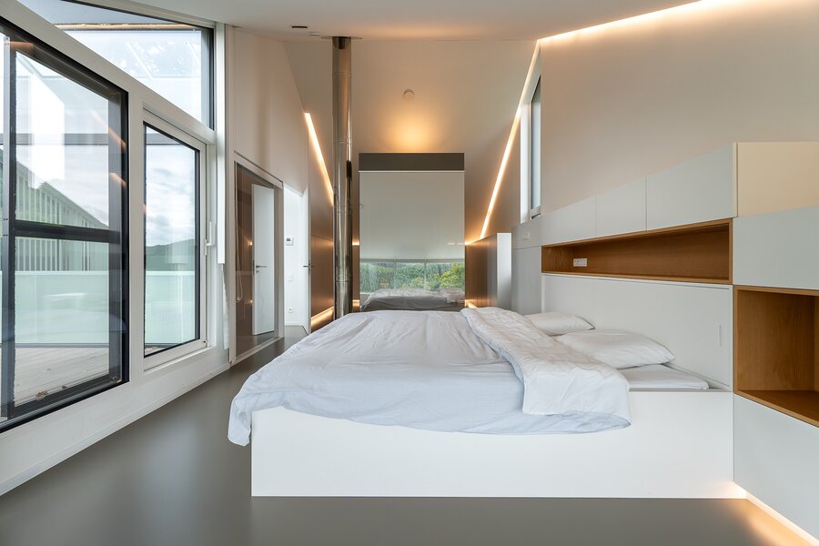 Het nachtgedeelte omvat meerdere comfortabele slaapkamers, waaronder een verfijnde master suite met dressing en privatieve badkamer. De mooie plafondhoogtes versterken het gevoel van ruimte en openheid, kenmerkend voor deze architecturale realisatie.