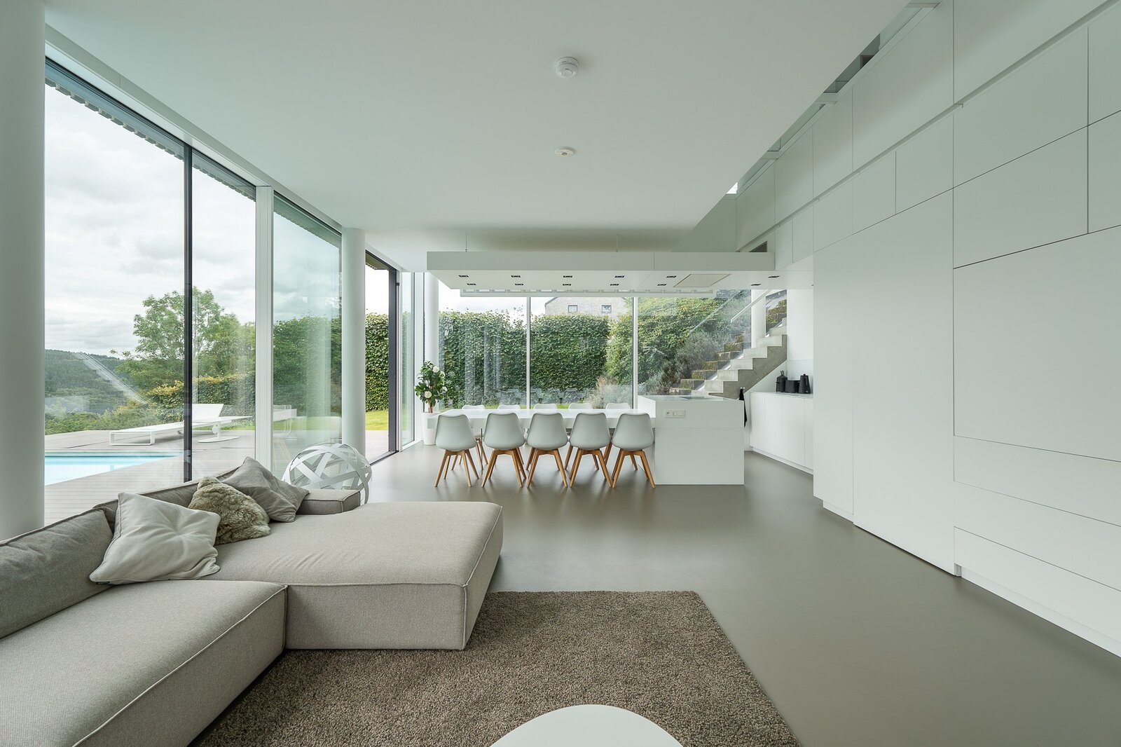 De elegante en uitnodigende leefruimte vloeit harmonieus over in een volledig uitgeruste keuken met sobere, tijdloze afwerkingen. Het geheel geeft uit op het terras en de aangelegde tuin met zwembad, ideaal voor ontspanning en een verfijnde buitenbeleving. De technische ruimtes — bijkeuken, functionele wasruimte en garage — zijn ontworpen met het oog op optimaal dagelijks comfort.
