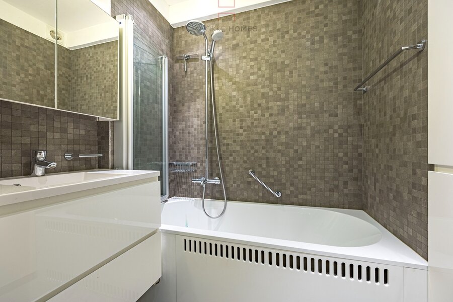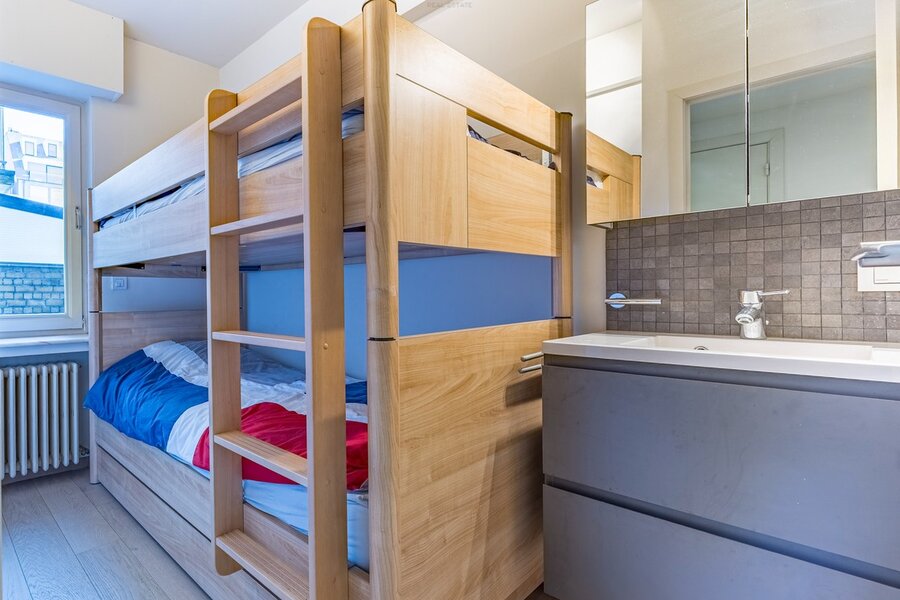 Instapklaar appartement op de Zeedijk met een mooi frontaal zeezicht. Gelegen nabij het Driehoeksplein - tussen het Lichttorenplein en het Albertplein. 1ste verdieping. Kleinere residentie (1 appartement per verdieping). Actuele indeling: inkom en afzonderlijk gastentoilet. Ruime en brede leefruimte met maatwerk kasten. Parket. Vanuit de leefruimte geniet men van een mooi frontaal en quasi kamerbreed zeezicht. Gezellig salon met vaste zitbank. Volledig geïnstalleerde open maatwerk keuken met natuurstenen werkblad en voorzien van alle inbouwtoestellen van Miele (o.a. stoomoven, vaatwas, etc..) met aanpalende eethoek. Glazen deur als scheiding met de nachthall. Volwaardige slaapkamer voor dubbel bed en grote ingemaakte kast. Tweede slaapkamer (stapelbed) met wastafel. Beide slaapkamers uitgevend op area. Afzonderlijke badkamer met lavabo en ligbad / douche en inbouwkasten. Elektrische rolluiken alom en een optimale benutting van de oppervlaktes. Privatieve kelder in de residentie. Lift in het gebouw. Binnenin ruimer dan verwacht van buitenaf gezien ! Info en vrijblijvend bezoek via 050 760 760 of info@knokkehomes.be