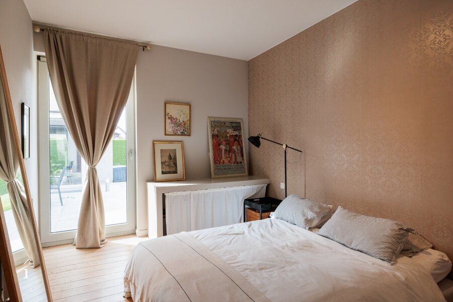 De lichtrijke leefruimte omvat een open, volledig geïnstalleerde keuken met keukeneiland en eethoek, afgewerkt met kwalitatieve materialen en toestellen. Daarnaast bevindt zich de zithoek, volledig omringd door glaspartijen en genietend van een prachtig zicht op de fraai aangelegde tuin. Voor extra sfeer en gezelligheid is de zithoek uitgerust met een ingebouwde gashaard.