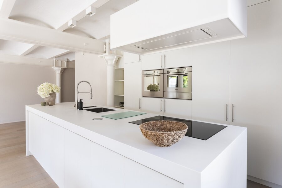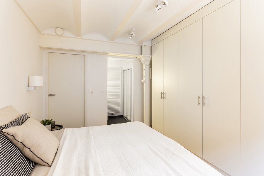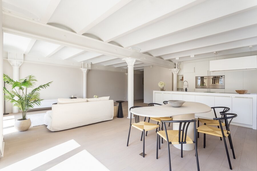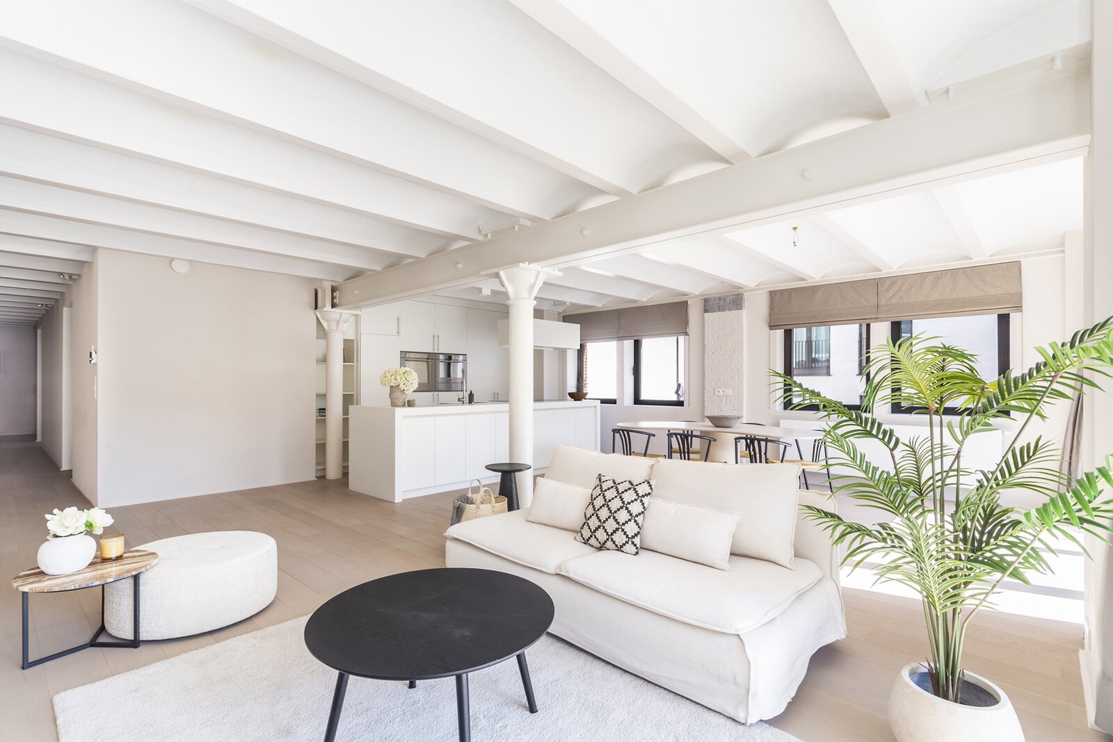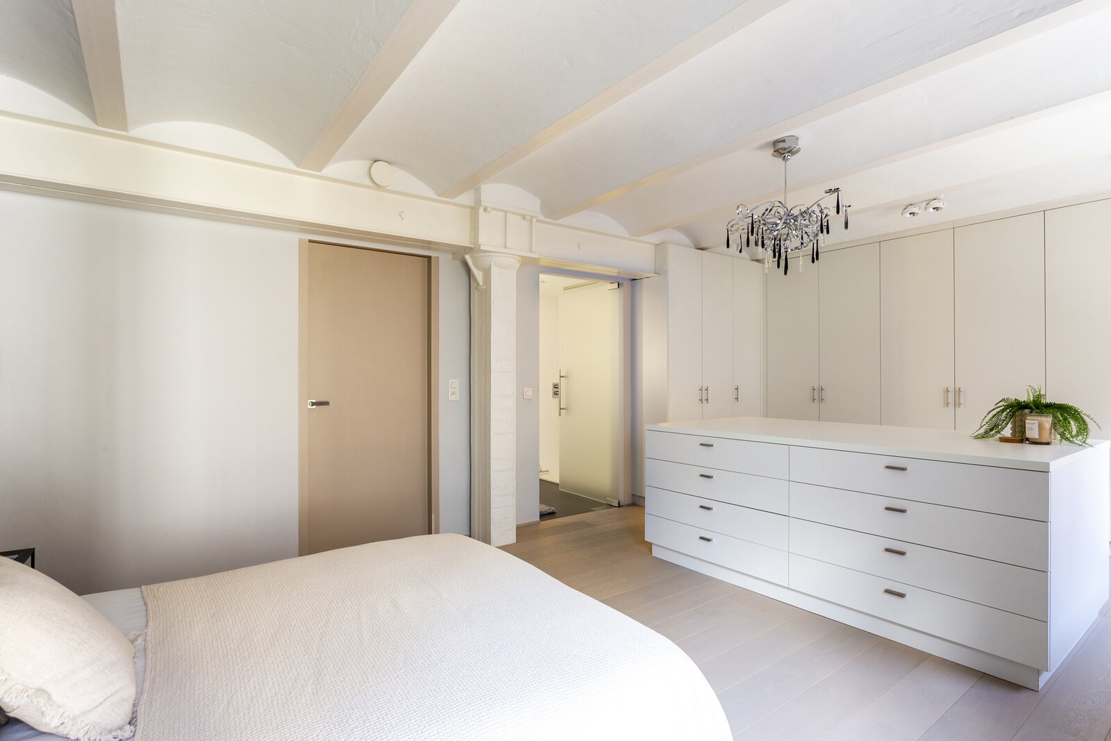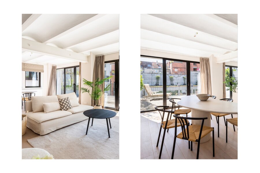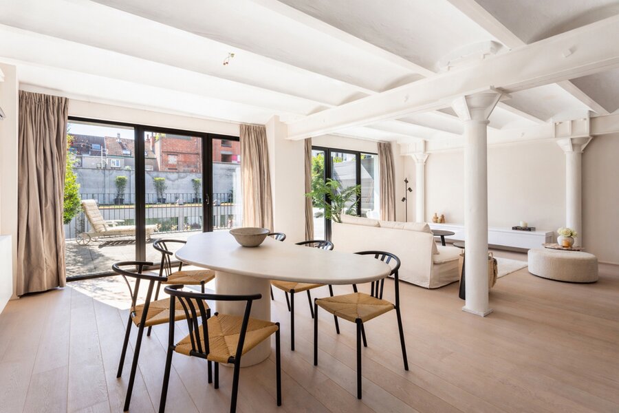 Het kloppend hart van de loft is de uitzonderlijk ruime leefruimte, die baadt in natuurlijk licht dankzij de grote raampartijen met directe toegang tot het terras. De open indeling zorgt voor een aangenaam en luchtig gevoel, waarbij de woonkamer, eetplaats en keuken harmonieus in elkaar overvloeien. De moderne, volledig uitgeruste keuken met kookeiland vormt een echte eyecatcher en is ideaal voor gezellige momenten. Authentieke elementen zoals zichtbare balken geven extra karakter, terwijl de lichte parketvloer en de afwerking zorgen voor een warme, stijlvolle en tijdloze uitstraling.
