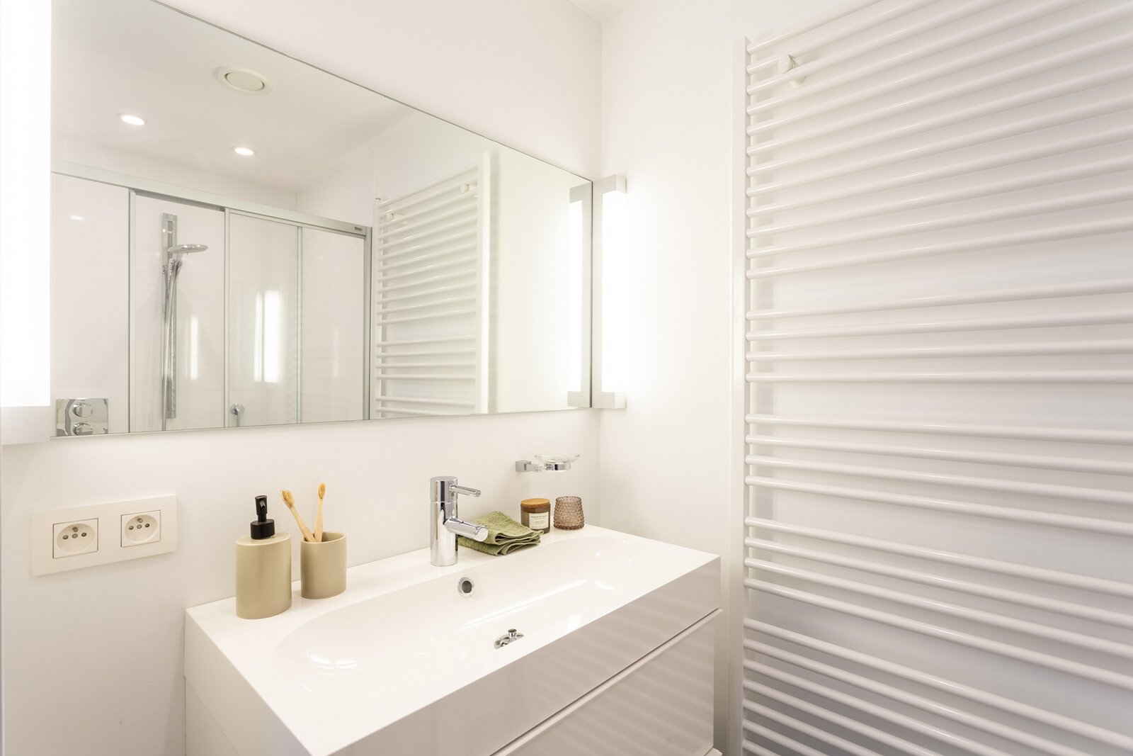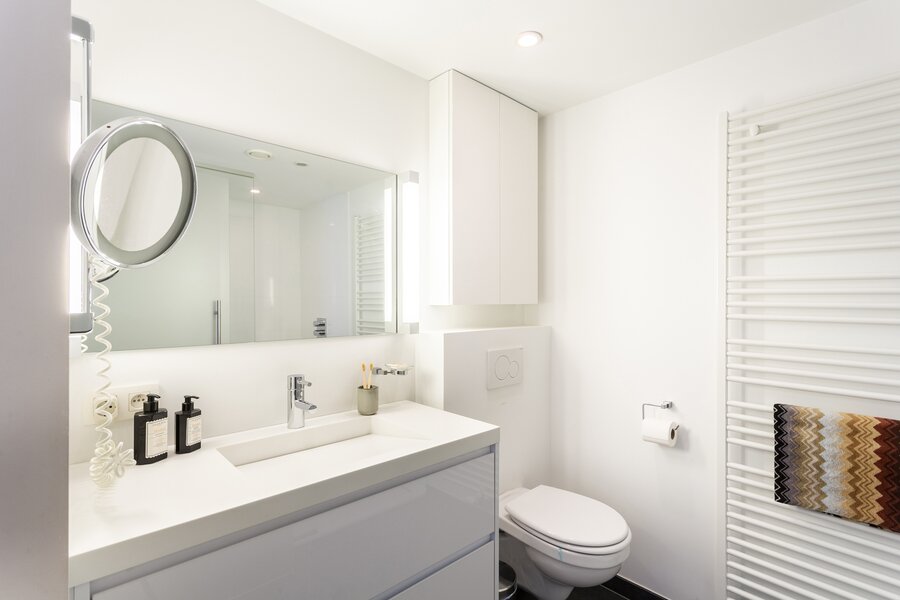 De masterbedroom beschikt over een ensuite badkamer met inloopdouche en wastafel met opbergmeubel, evenals een praktische dressing. Daarnaast is er een tweede volwaardige slaapkamer, eveneens voorzien van een ensuite badkamer en ruime kastruimte.