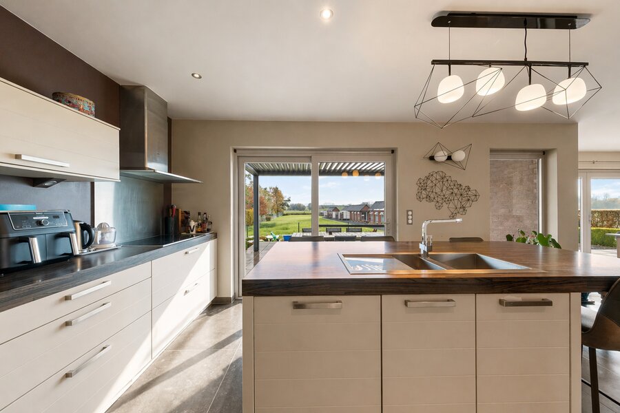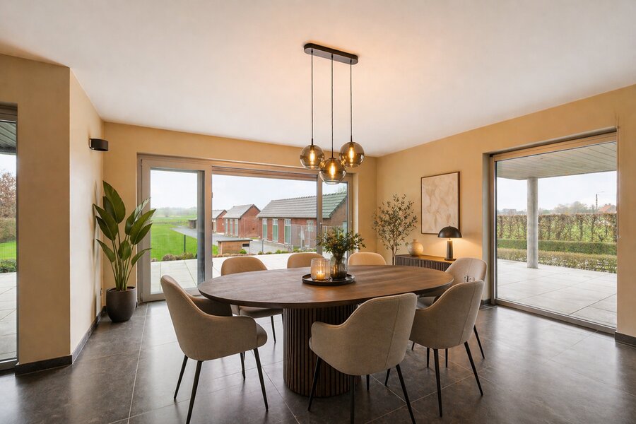 Zuidgericht terras met bioklimatische pergola waar je in alle rust geniet van het prachtige open zicht. Het perceel van meer dan 37 are biedt een grote tuin, ruime parkeermogelijkheden en volledige privacy. Extra troeven zijn de dubbele garage met verdieping en de volledig uitgeruste, onafhankelijke tiny house — ideaal als zorgwoning, gastenverblijf of verhuurunit.