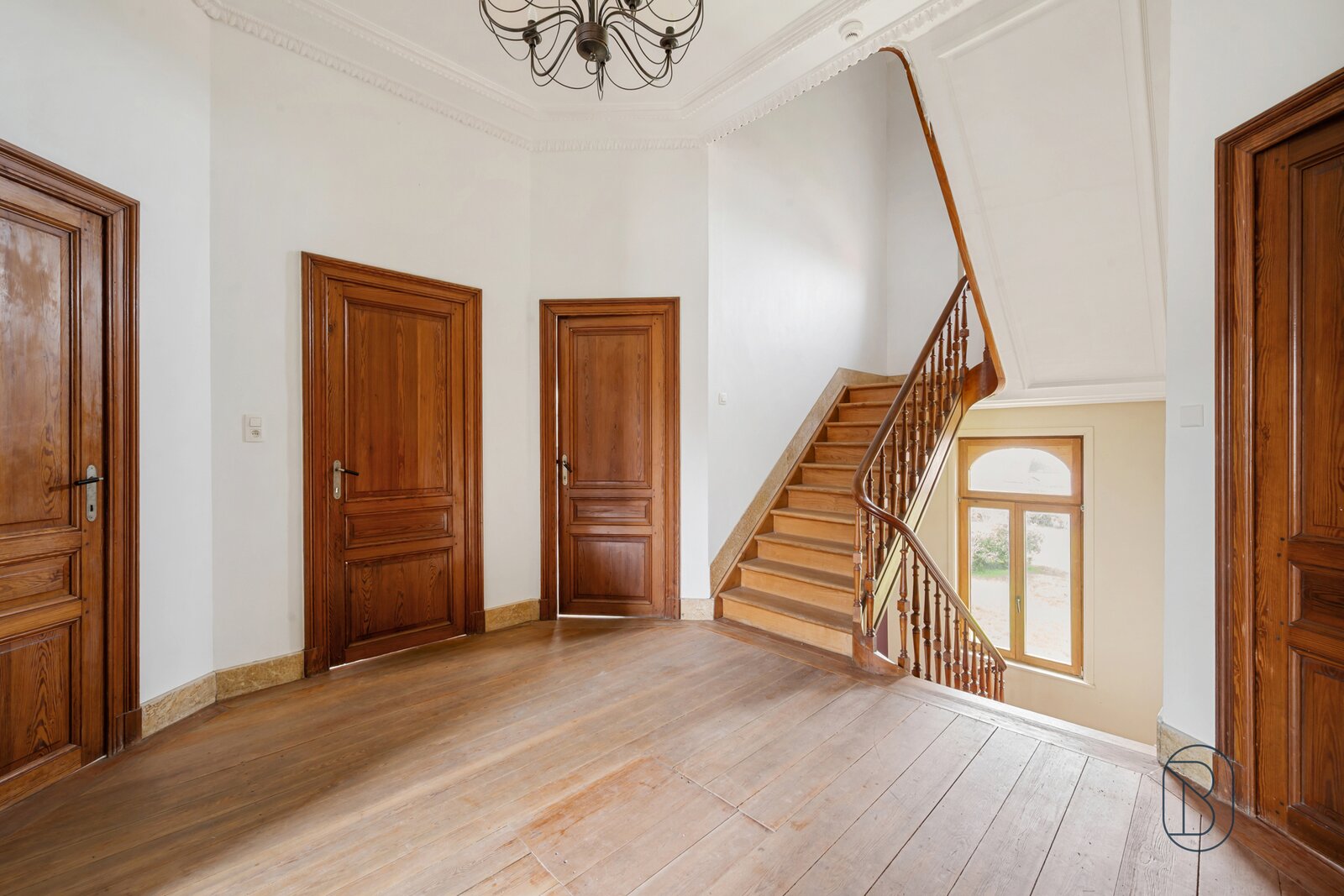 Gelijkvloers: ruime inkom- en traphal, gezellige dubbele leefruimte met authentieke schouw, parketvloer en karaktervolle deuren, geïnstalleerde keuken met extra eetplaats, bibliotheekruimte/bureau, berging, apart toilet en mooie kelder.