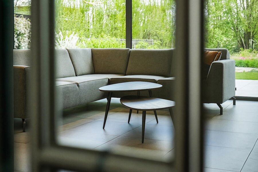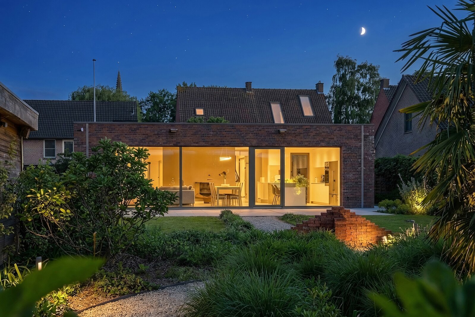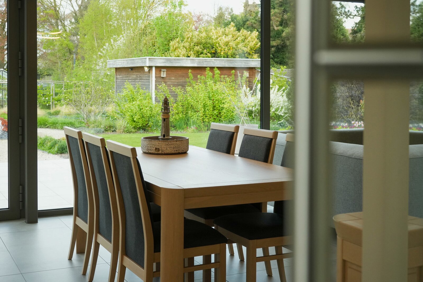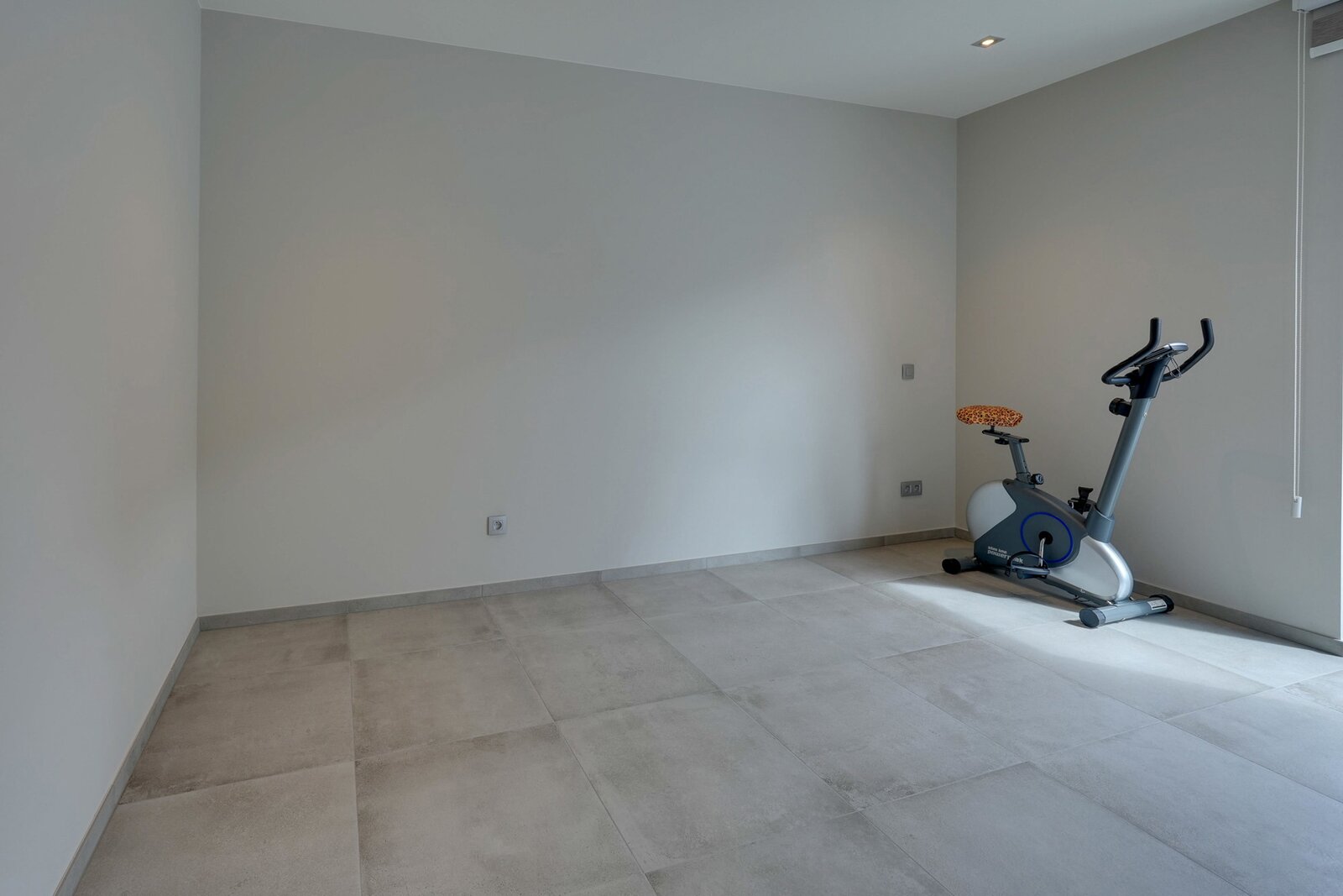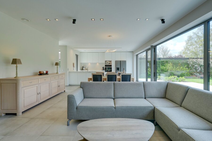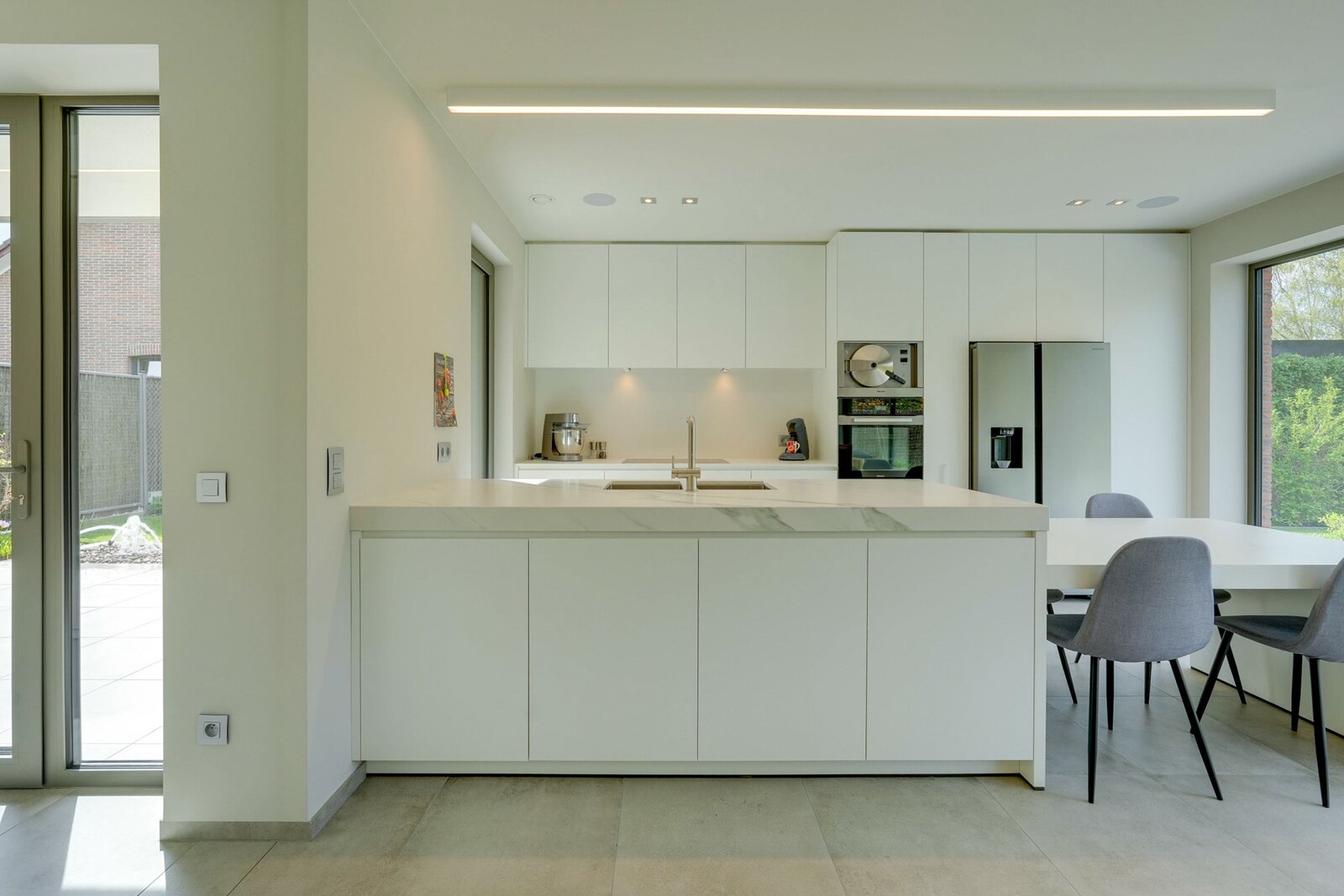 De leefruimte baadt in het licht dankzij de grote raampartijen met driedubbele beglazing en vormt één geheel met het terras en de tuin. Aansluitend vind je een open keuken die tot in de puntjes is uitgerust met kwalitatieve toestellen, waaronder twee ovens (waarvan één stoomoven), een inductiekookplaat, vaatwasser en een stijlvol werkblad.