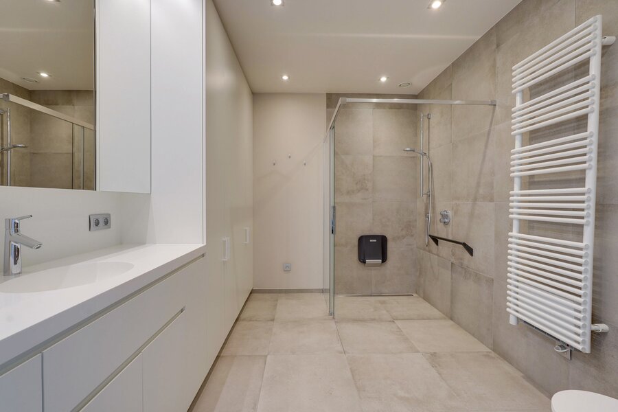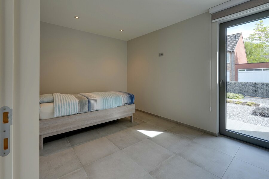 Verder beschikt de woning over twee ruime slaapkamers en een aparte bureauruimte met eigen toegang, die ook perfect kan dienen als extra slaapkamer of praktijkruimte. De badkamer is modern afgewerkt met een inloopdouche en een strak wastafelmeubel. Daarnaast is er een afzonderlijk toilet en een praktische dressing met ingewerkte opbergruimte.