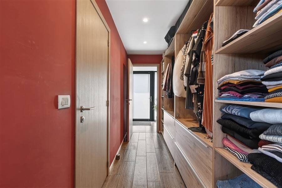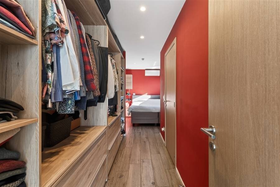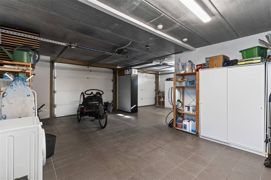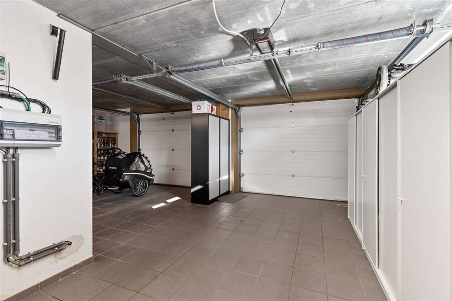 Gelijkvloers: inkomhal – apart toilet – leefruimte met zithoek en open keuken met toestellen – dressing – badkamer met douche – slaapkamer – twee garages.