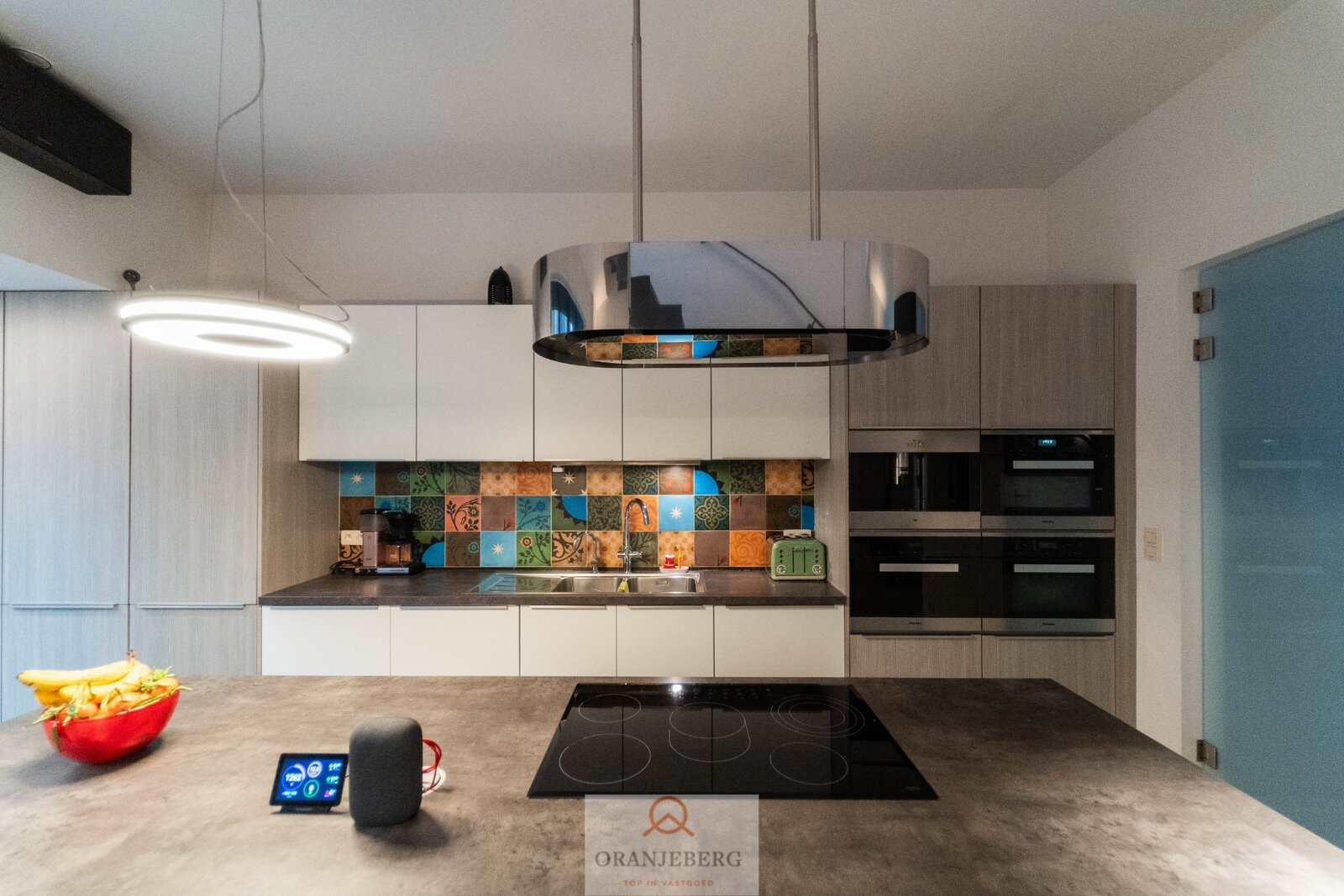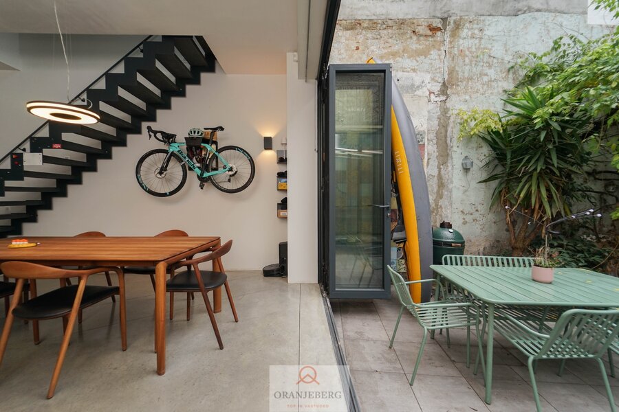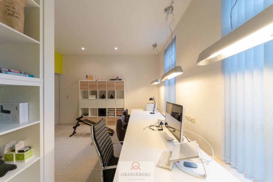 Via de trap bereikt u de lichtrijke living, waar de vele raampartijen zorgen voor een overvloed aan natuurlijk licht en een open, aangename sfeer. Aangrenzend vindt u een volledig ingerichte bureau- of werkruimte, perfect voor wie van thuis uit werkt.
