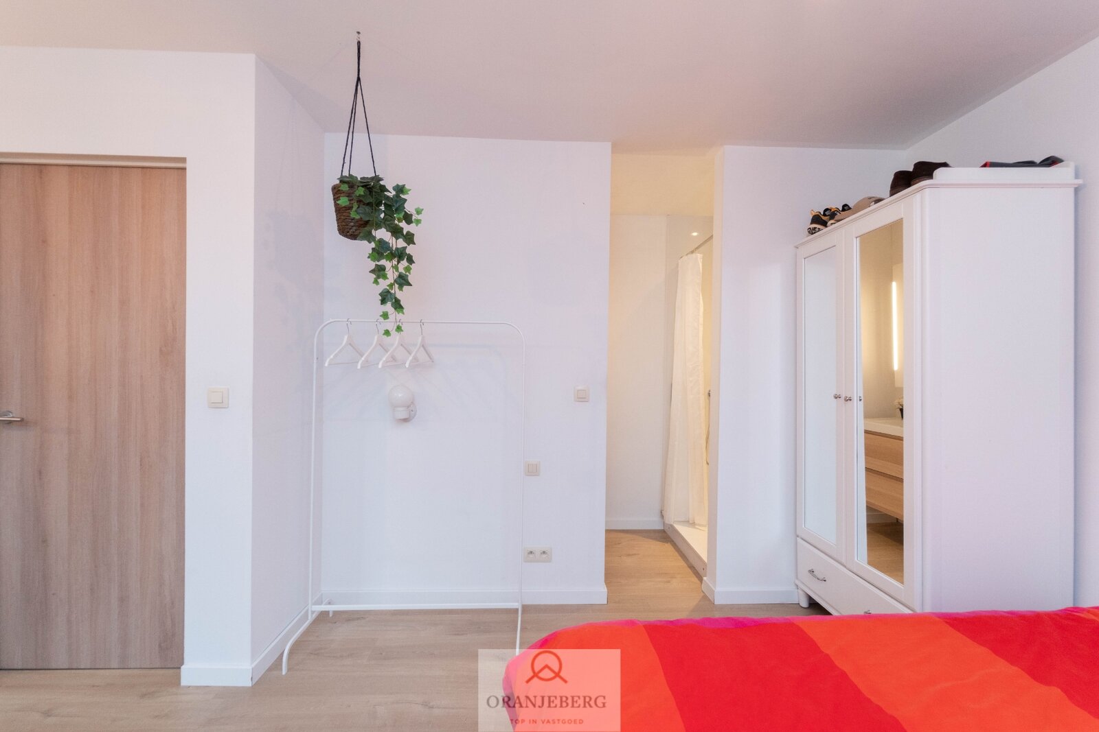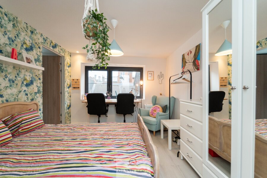 De gang naast de keuken is slim ingericht met ingebouwde kasten, ideaal voor extra opbergruimte. Daarnaast beschikt het gelijkvloers over een bijkomende kamer met extra douche en een kelder.