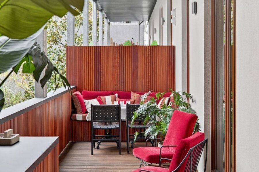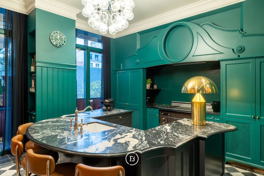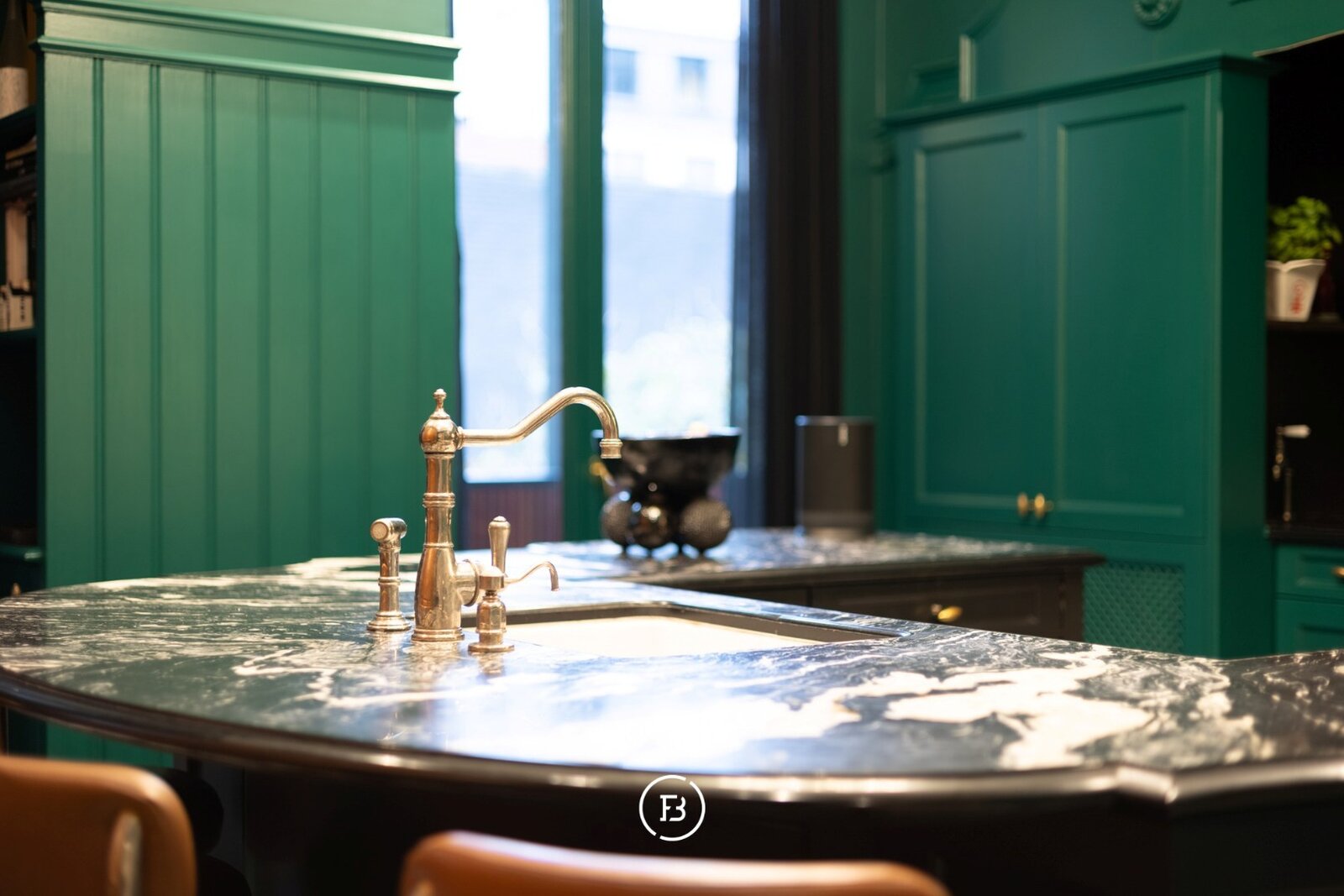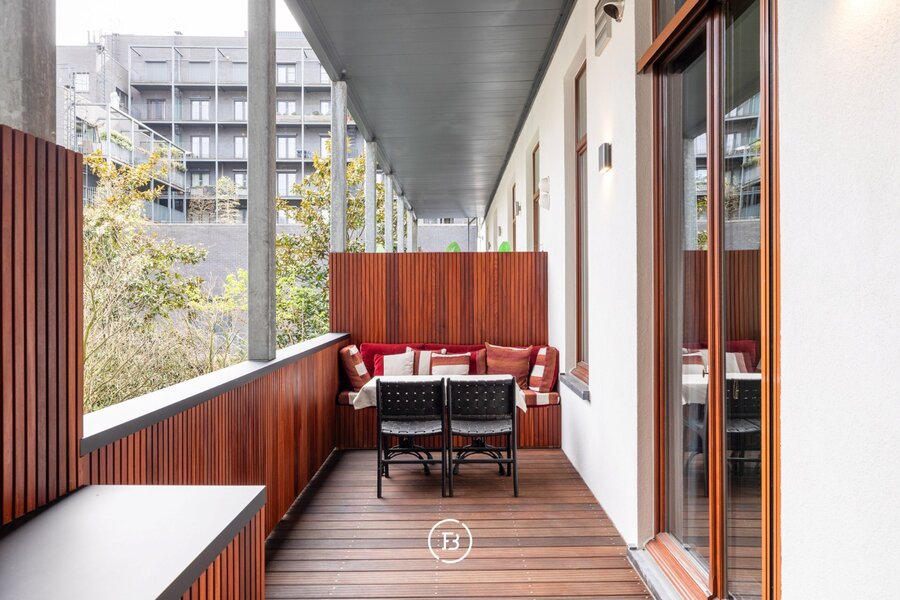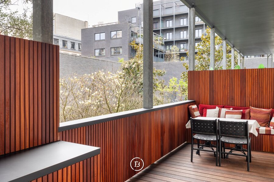 De volledig geïnstalleerde keuken met ontbijthoek vormt het kloppend hart van de woning en geeft uit op het zuidoost gerichte terras met uitzicht op de binnentuin en de historische Handelsbeurs, een oase van rust midden in de stad.