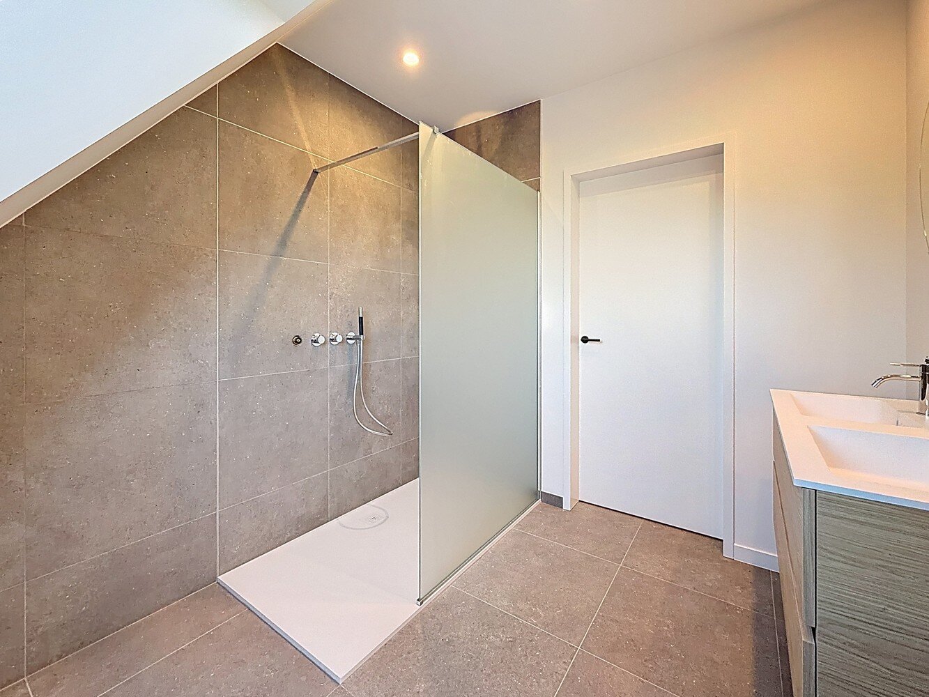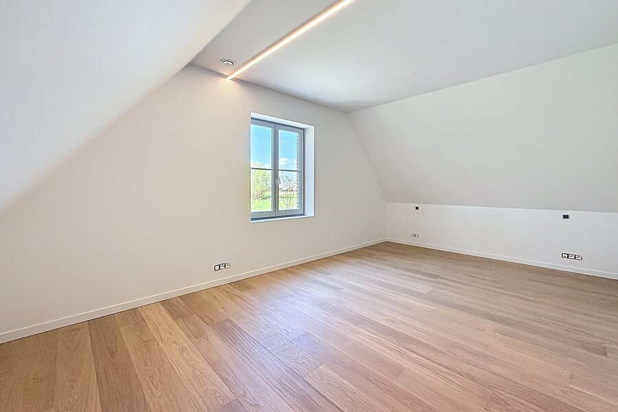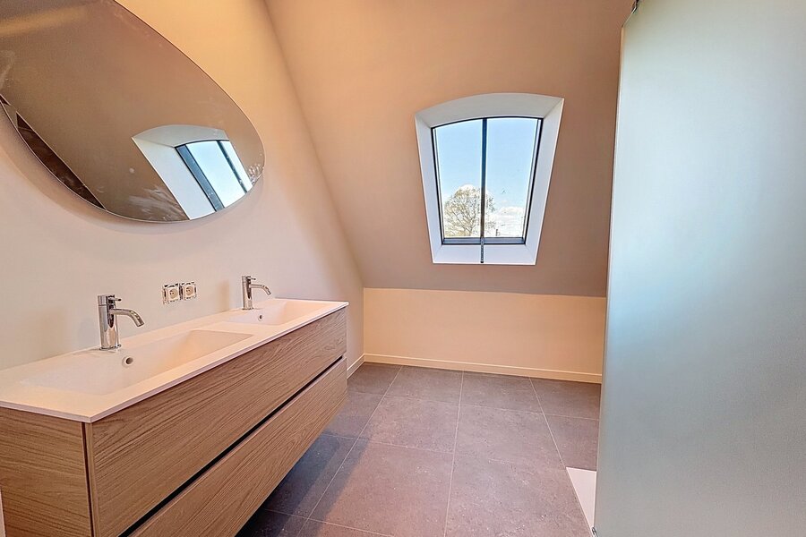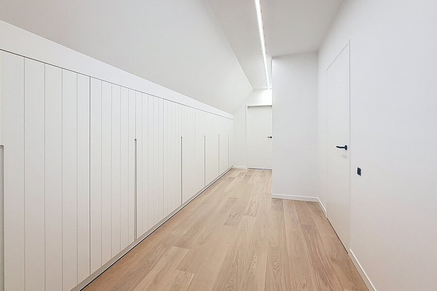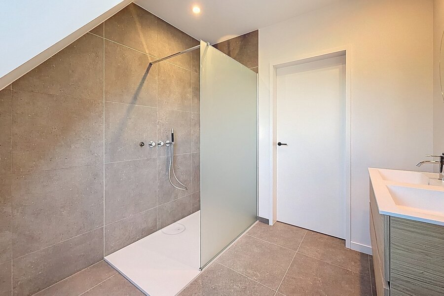 Op het gelijkvloers bevindt zich een volwaardige slaapkamer met aansluitende badkamer, ideaal voor wie gelijkvloers wenst te wonen of extra comfort zoekt. De eerste verdieping biedt plaats aan twee ruime slaapkamers, een tweede badkamer, een praktische technische-/bergruimte en een nachthal voorzien van ingebouwde kasten, wat zorgt voor extra opberggemak.