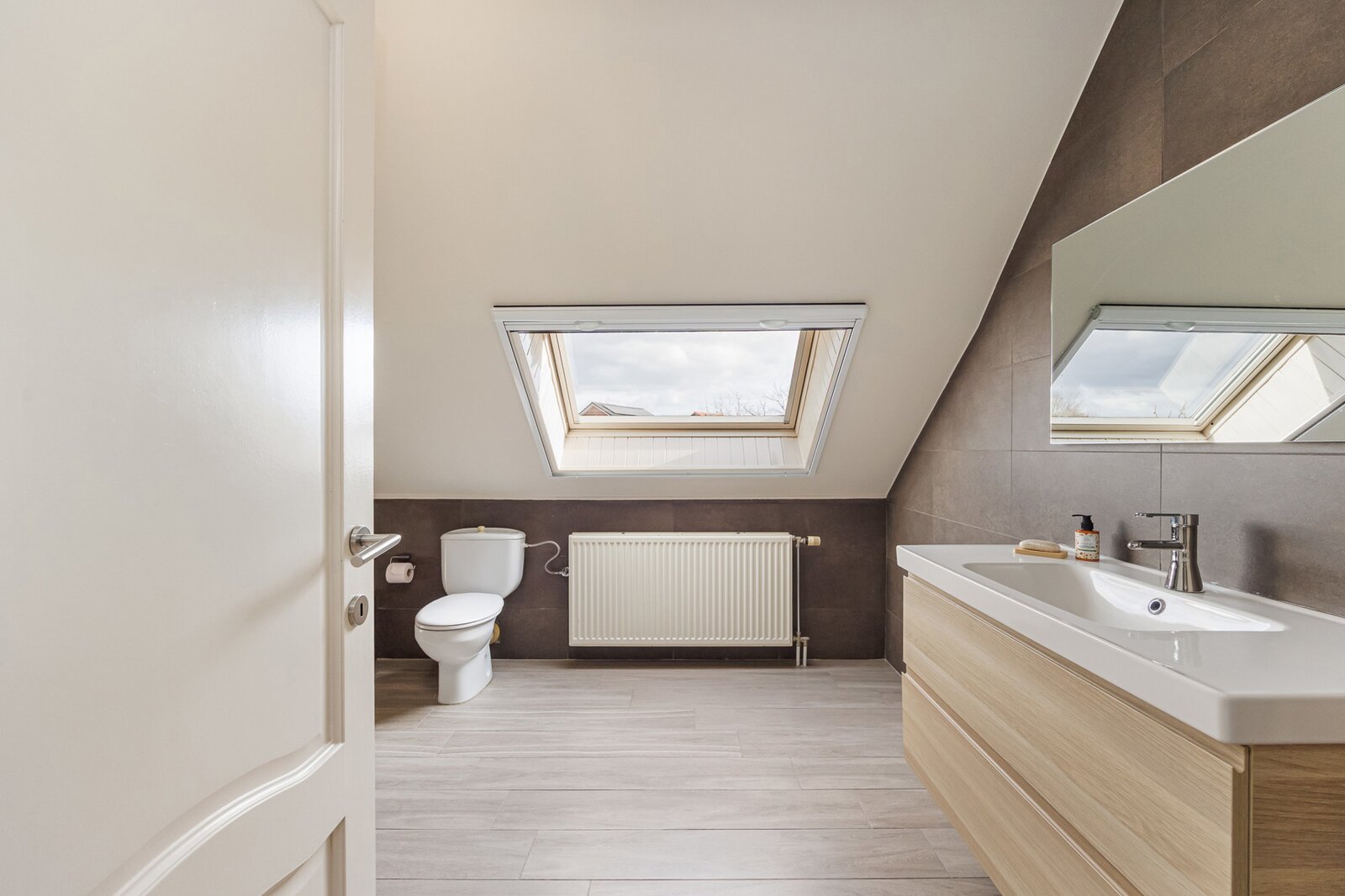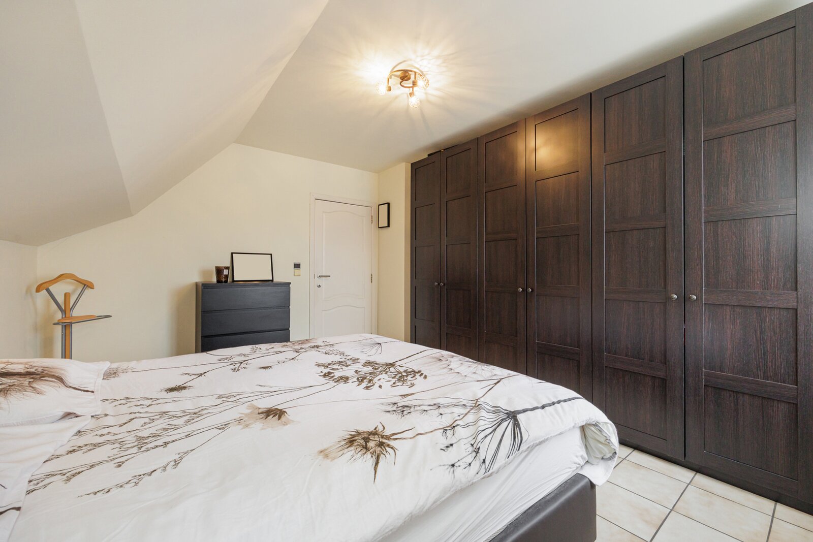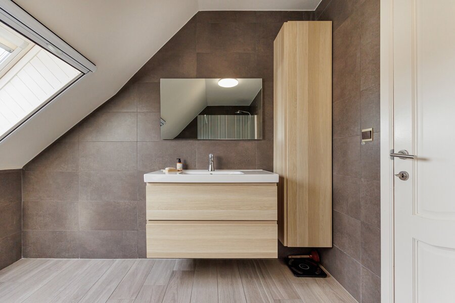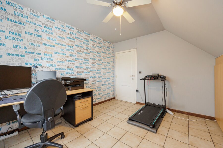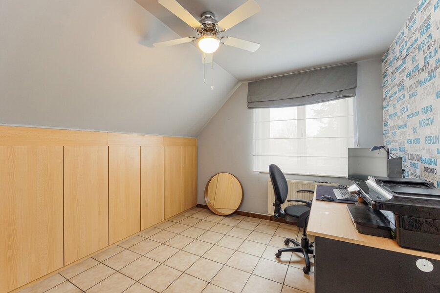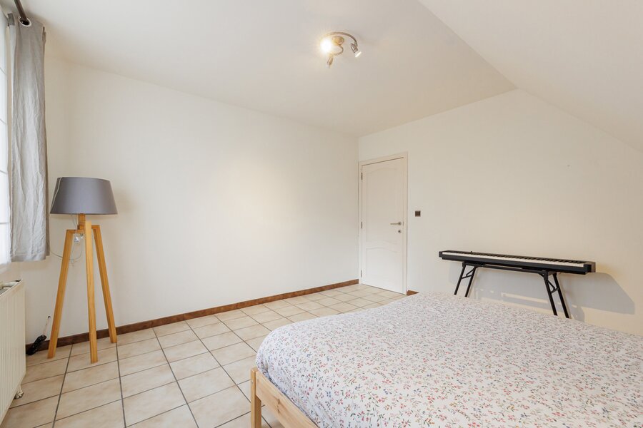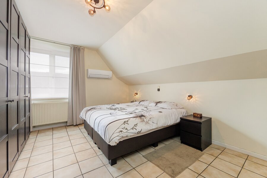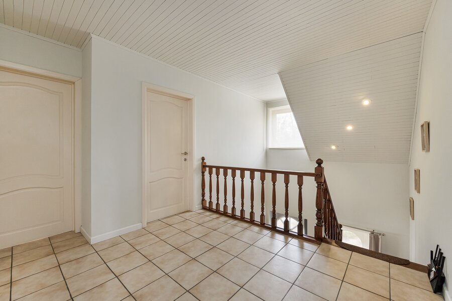 Terug naar de inkomhal, bereik je via de statige, eiken trap een ruime overloop. Deze leidt naar de 4 ruime slaapkamers en de vernieuwde badkamer met diepe inloopdouche. Via het zolderluik in één van de slaapkamers bereik je bovendien de bergzolder.