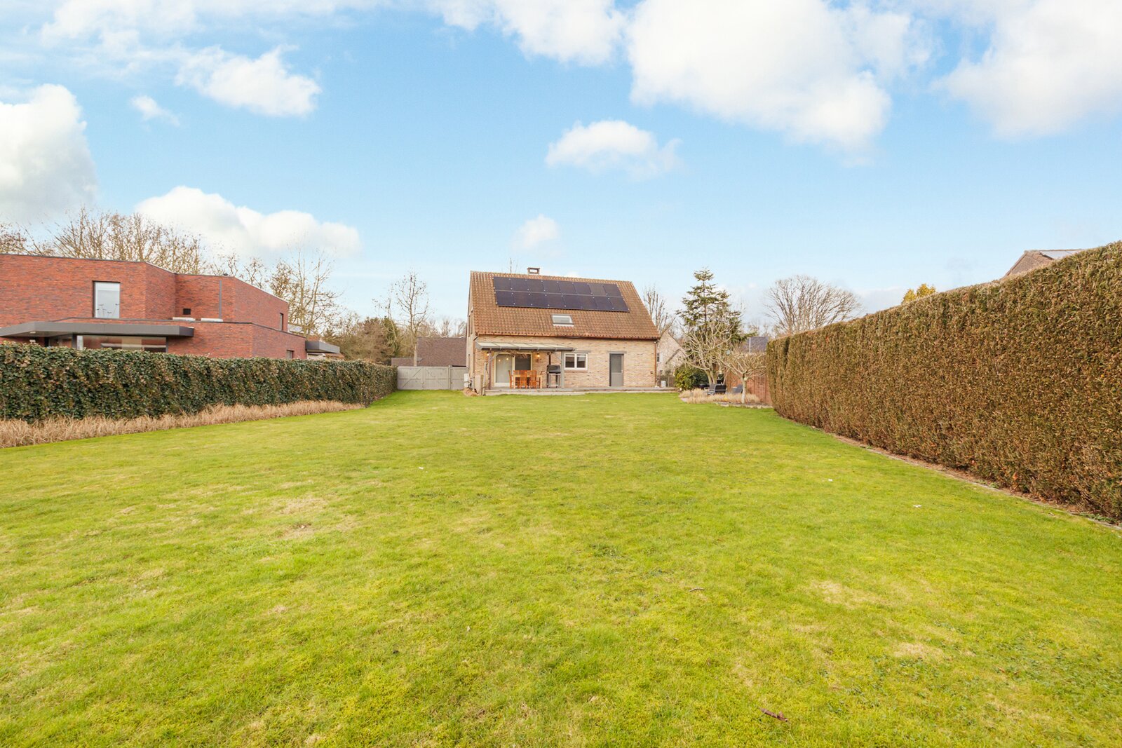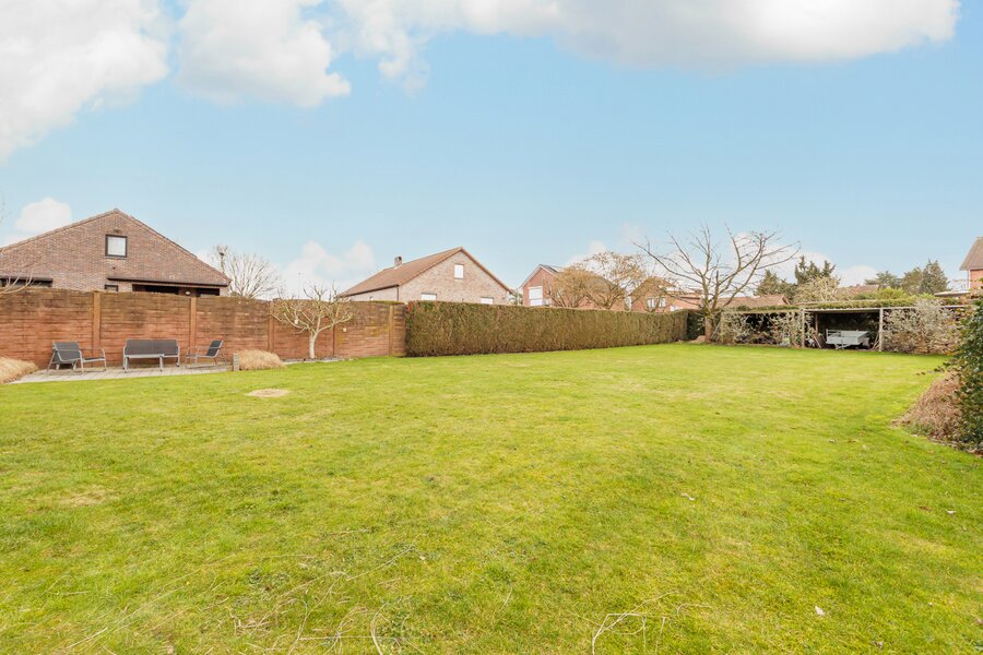 Stilstaan bij de buitenzijde van de woning is ook de moeite waard. De tuin is zuidoostelijk gericht en geniet dus een ideale oriëntatie. De volledige tuin is omheind, uitgerust met een draaipoort (voor de wagen) en 2 tuinpoortjes. Een groot betegeld zonneterras (deels overdekt) garandeert genieten van de lente- en zomerdagen. De ruime grastuin werd voorzien van een automatisch sproei-systeem.