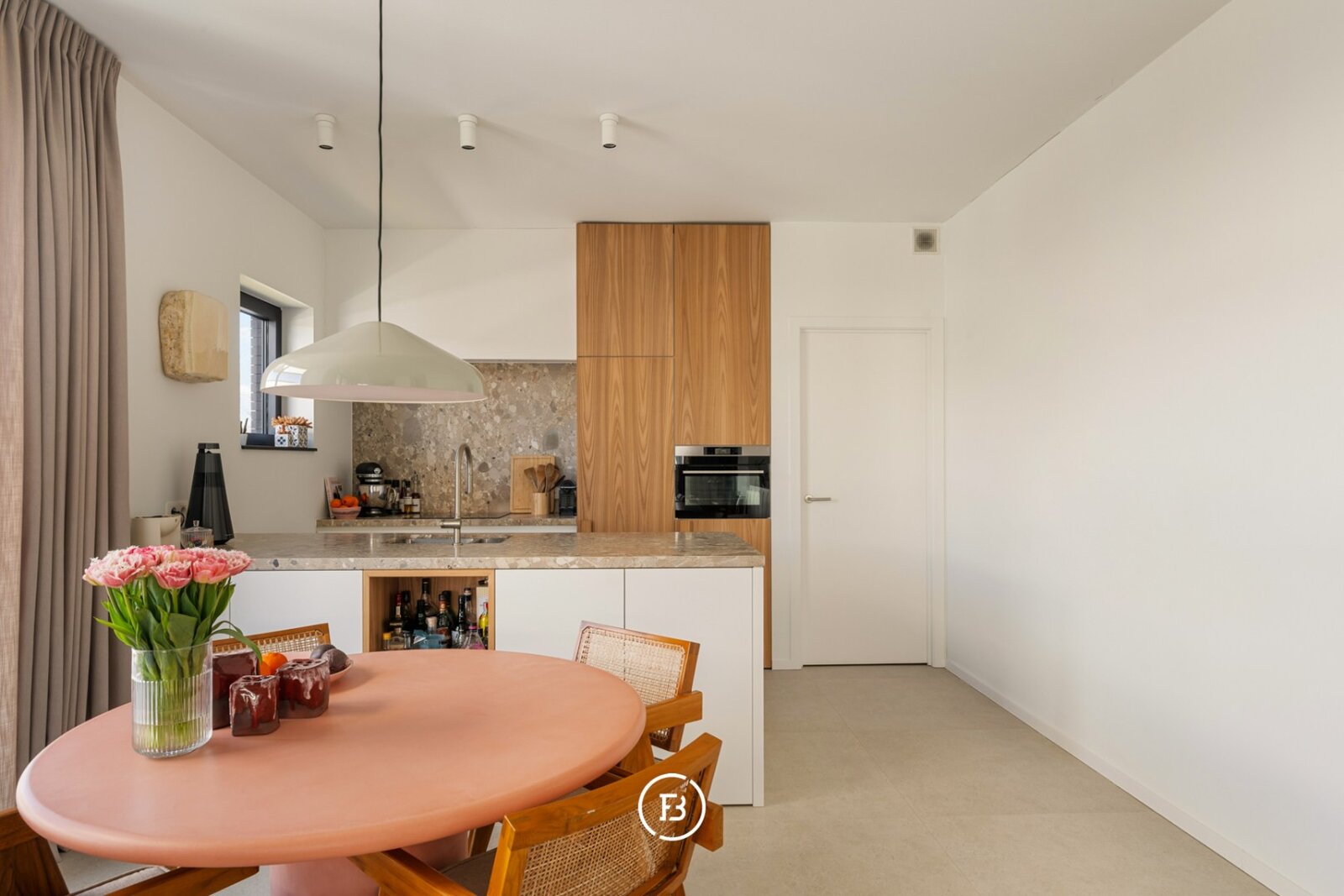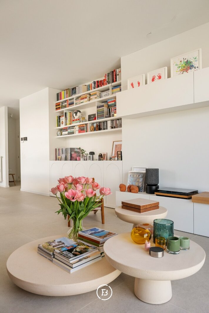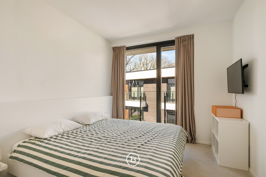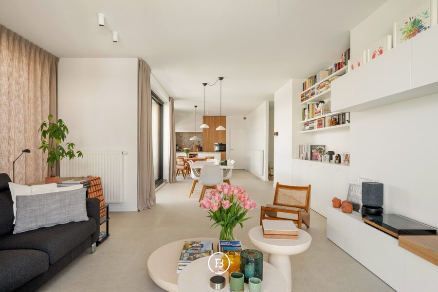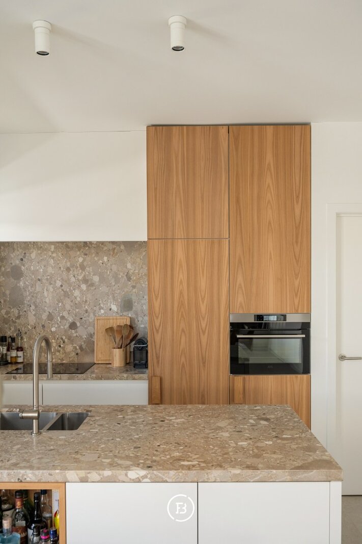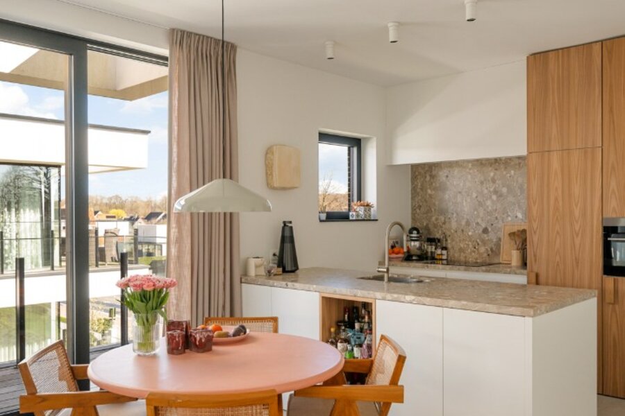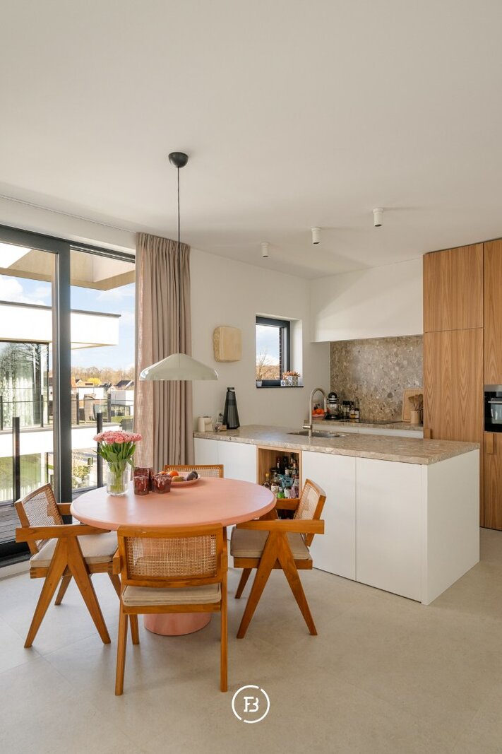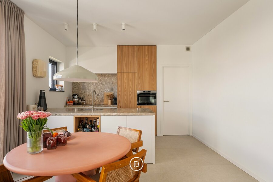 Het appartement beschikt over een aangename leefruimte met voldoende plaats voor een ruime eettafel en een gezellige ontbijthoek. De open keuken werd volledig op maat uitgewerkt met designkasten en sluit naadloos aan op de leefruimte. Aansluitend is er een praktische berging voorzien.