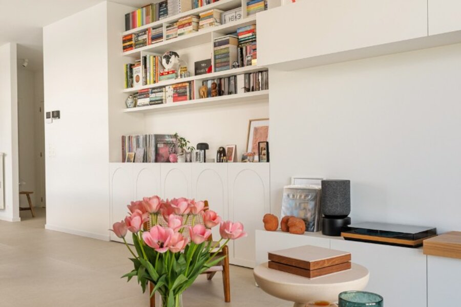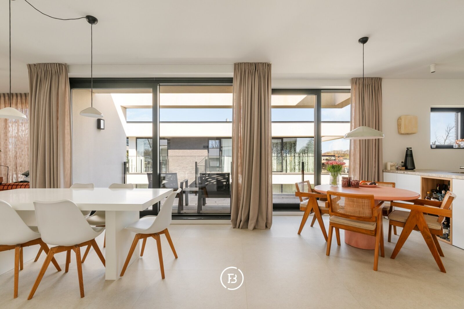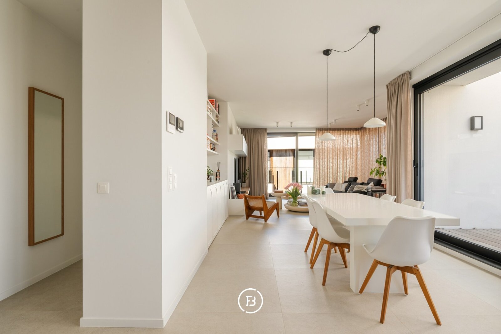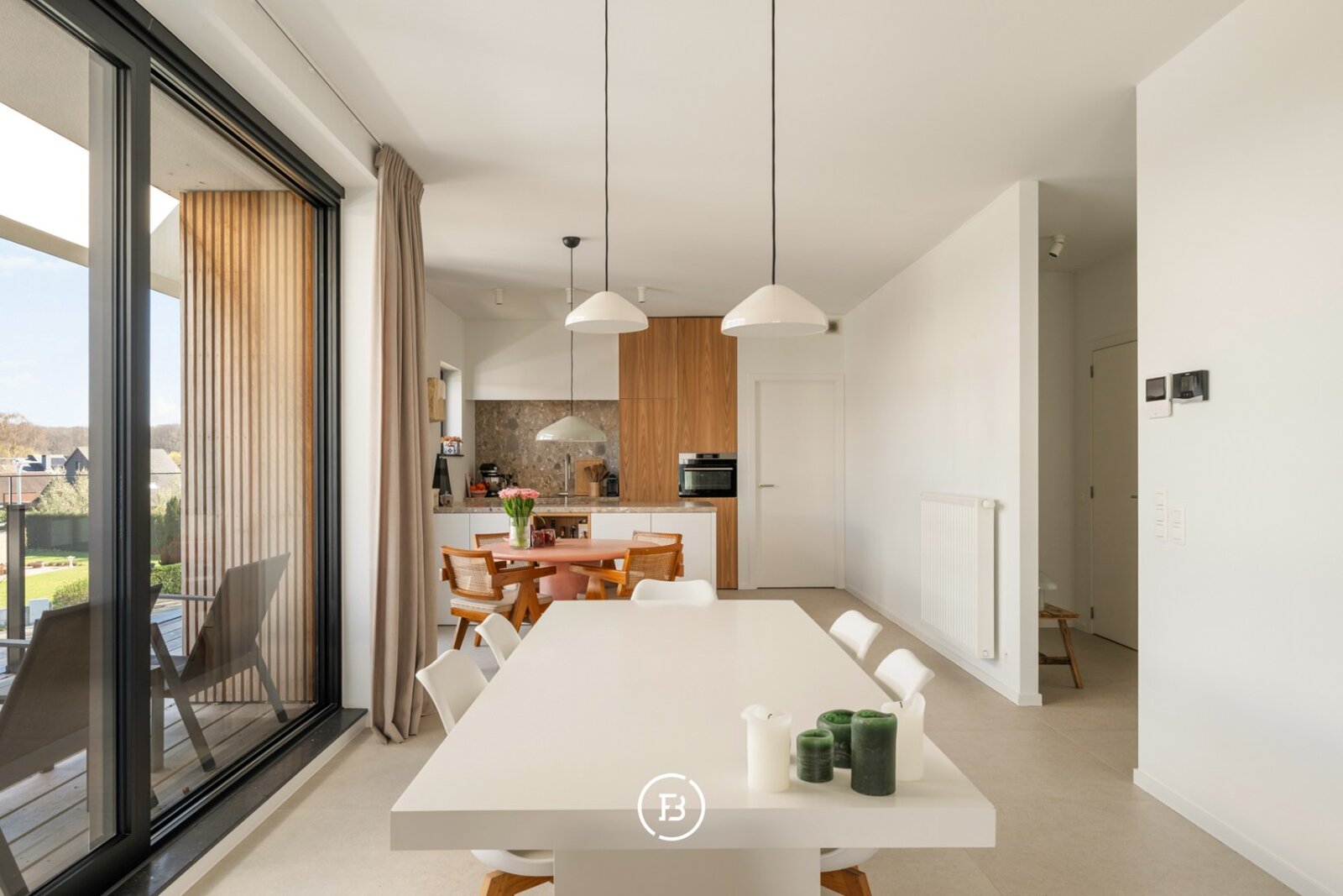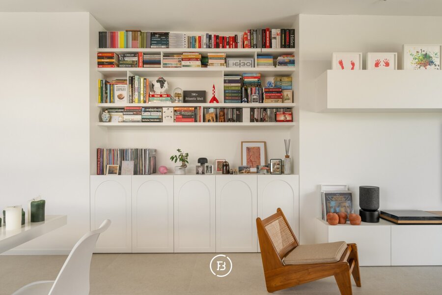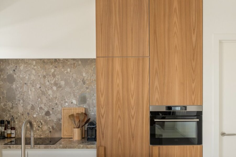 Het appartement beschikt over een aangename leefruimte met voldoende plaats voor een ruime eettafel en een gezellige ontbijthoek. De open keuken werd volledig op maat uitgewerkt met designkasten en sluit naadloos aan op de leefruimte. Aansluitend is er een praktische berging voorzien.