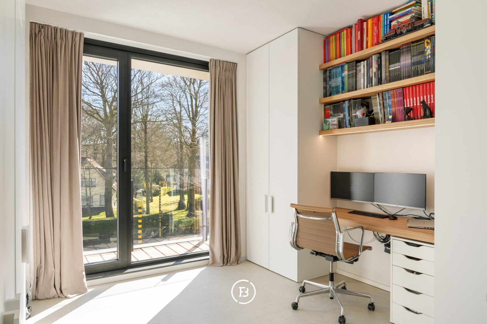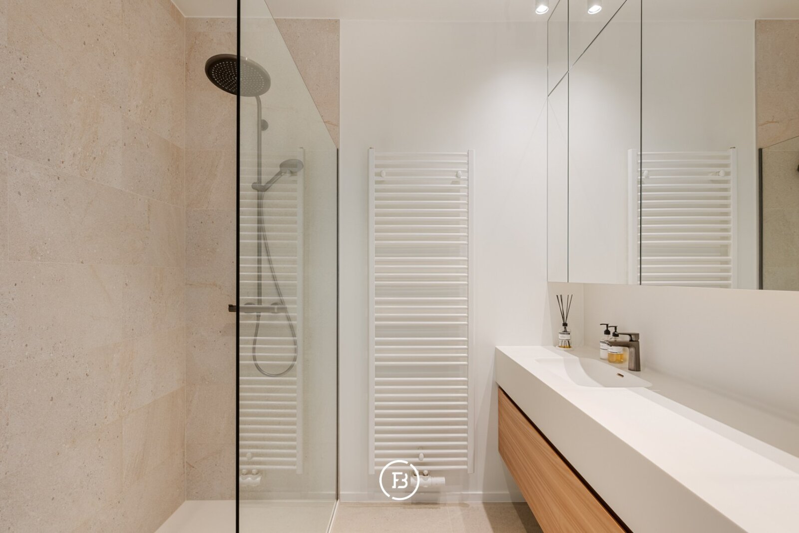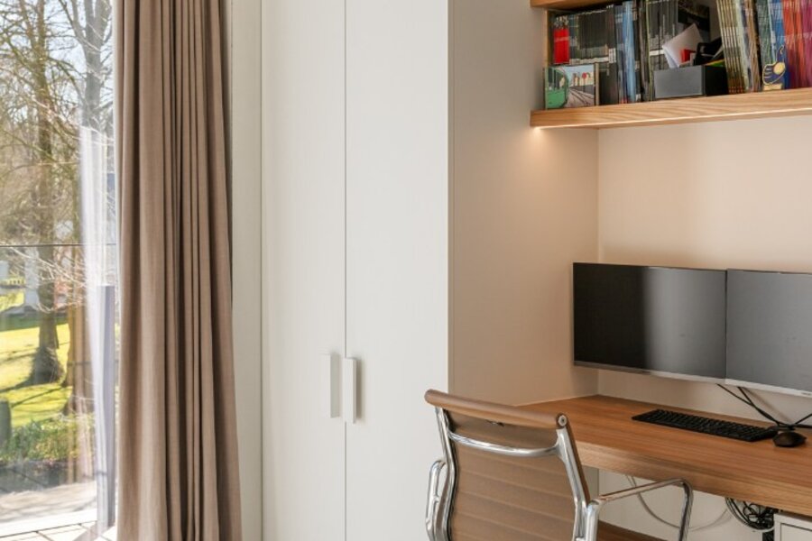 Er zijn twee slaapkamers, waarvan één momenteel ingericht is als bureel. Dankzij het ingewerkte uitklapbed kan deze ruimte eenvoudig opnieuw als volwaardige slaapkamer worden gebruikt. De tweede slaapkamer is ruim en comfortabel. De badkamer is uitgerust met een douche en dubbele lavabo.