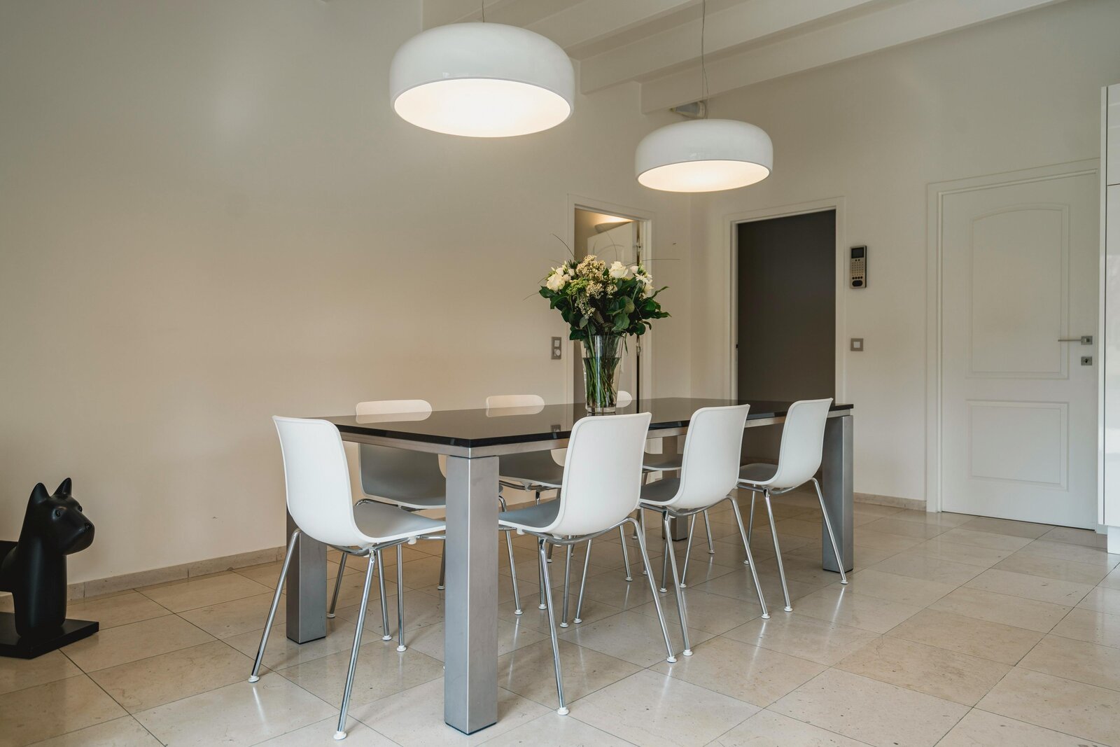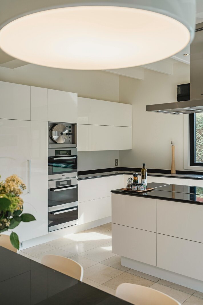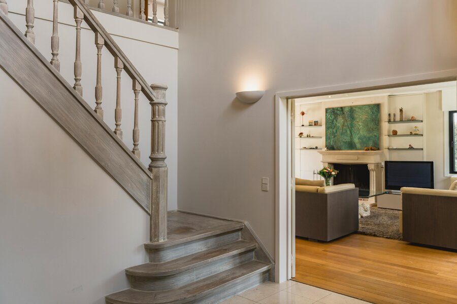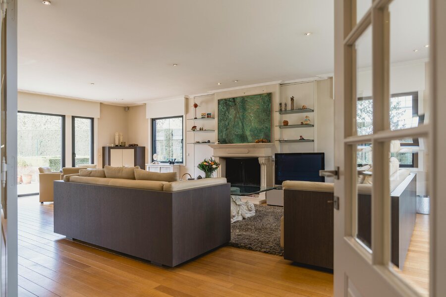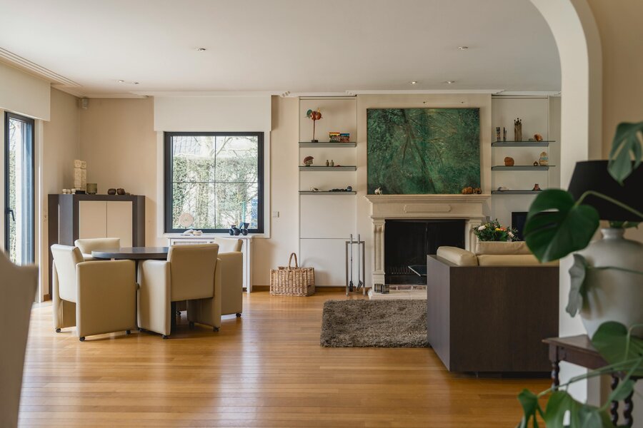 De imposante inkomhal leidt naar een royale leefruimte met een karaktervolle archway, een sfeervolle haard en warme parketvloeren. Dankzij de grote raampartijen vloeit de eetkamer naadloos over in de groene omgeving. De hoogwaardige leefkeuken is een droom voor elke hobbykok, uitgerust met een natuurstenen kookeiland en Miele-toestellen.