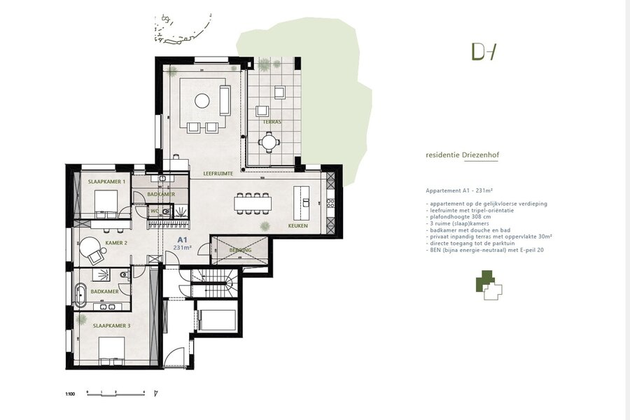 In residentie "Driezenhof" gaat een uiterst smaakvolle en tijdloze uitstraling hand in hand met natuurlijke materialen en de allerbeste, geavanceerde technieken: Geothermische warmtepomp, vloerverwarming + koeling, een ventilatiesysteem D met warmterecuperatie, zonnepanelen voor het collectieve verbruik met de mogelijkheid om uit te breiden met een privatieve installatie,...