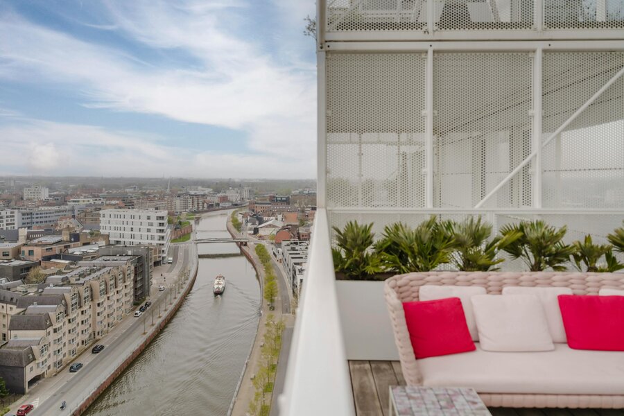 De prachtige uitzichten over de Leie en stad Kortrijk, tot aan de Kluisberg, Heuvelland of Gent, zijn alvast adembenemend! De high-end afwerking met oog voor detail en luxe, de mooie woonvolumes, de 3 terrassen, ... het zijn slechts enkele van de troeven van dit uitzonderlijk appartement!