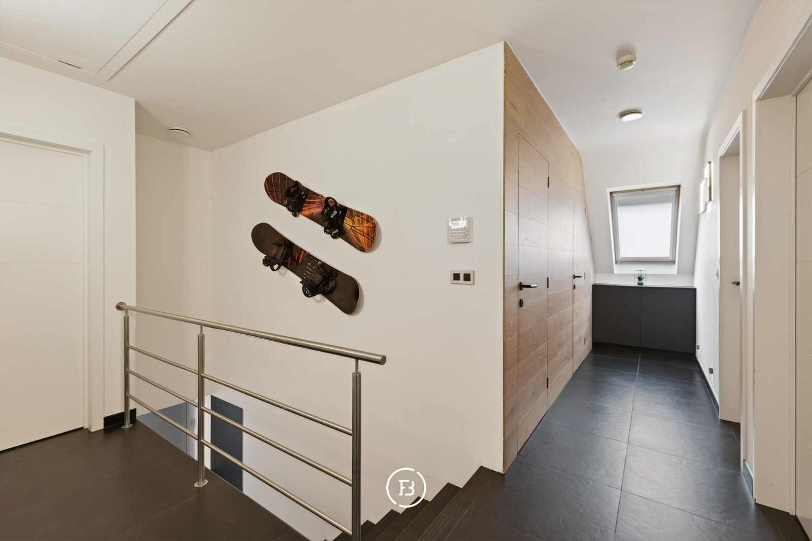 Op de verdieping vindt u vier volwaardige slaapkamers. De master bedroom is voorzien van een dressing en een luxueuze badkamer met jacuzzi bad. Een extra douchekamer zorgt voor optimaal comfort voor het hele gezin.