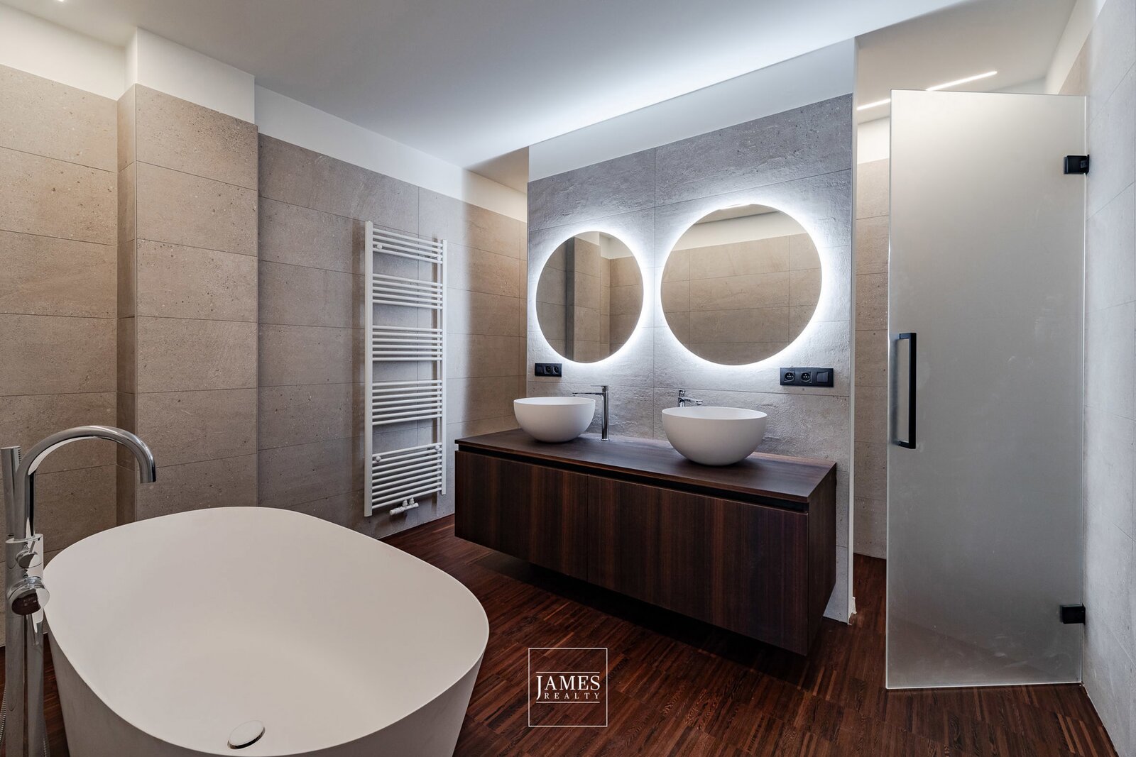 Het nachtgedeelte omvat drie slaapkamers en drie badkamers, waaronder een master suite op tuinniveau, die rust en privacy biedt. De indeling werd zorgvuldig ontworpen met het oog op comfortabel gezinsleven.