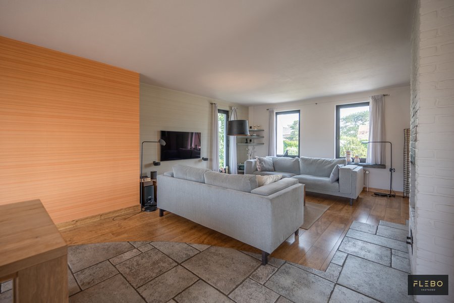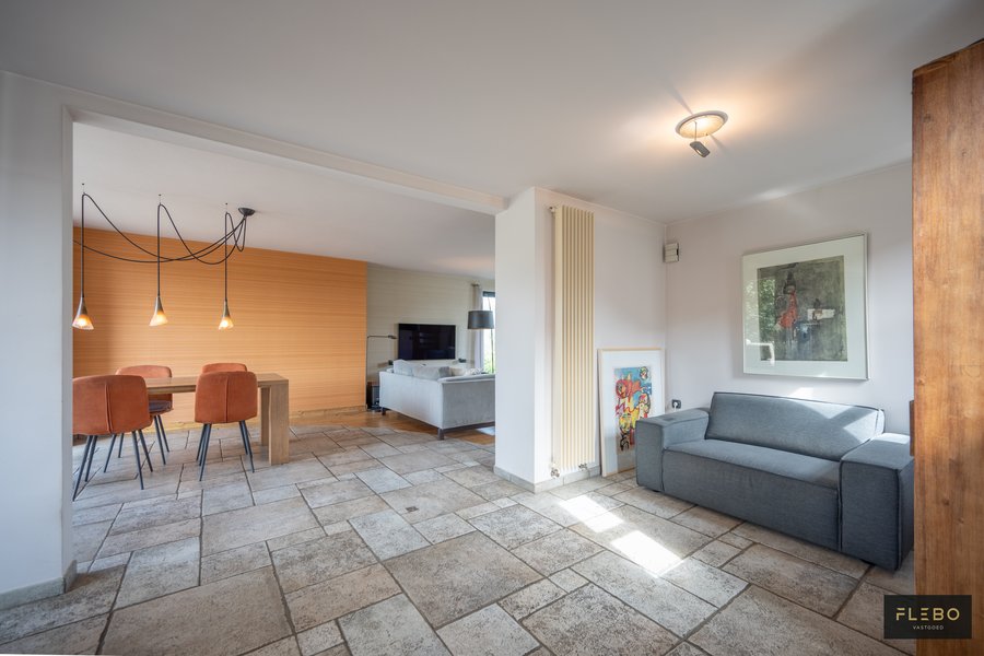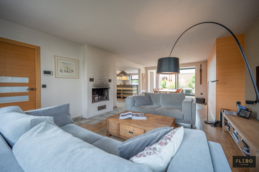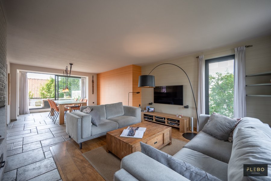 We betreden de woning via de ruime inkomhall welke rechtstreekse toegang biedt tot de lichtrijke, spacieuze leefruimte met salon voorzien van openhaard, eethoek en een open, volledig geïnstalleerde leefkeuken. Doorlopend begeven we ons tot het zeer ruime, Zuid-gerichte terras voorzien van Winsol-luifels.
