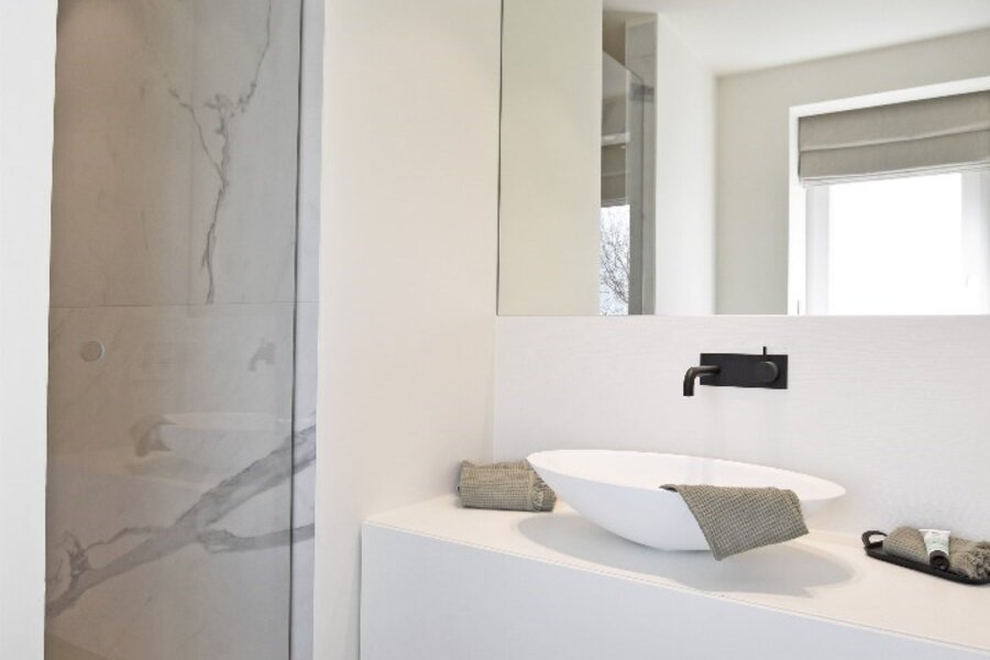 Indeling: inkomhal met vestiaire en gastentoilet, lumineuze leefruimte voorzien van een gashaard, open volledig geïnstalleerde keuken met eethoek. Master bedroom met ingemaakte kasten, gevolgd door badkamer (dubbele lavabo en ligbad), tweede en derde volwaardige slaapkamer, telkens ook voorzien van een privatieve douchekamer, apart toilet in de nachthal.