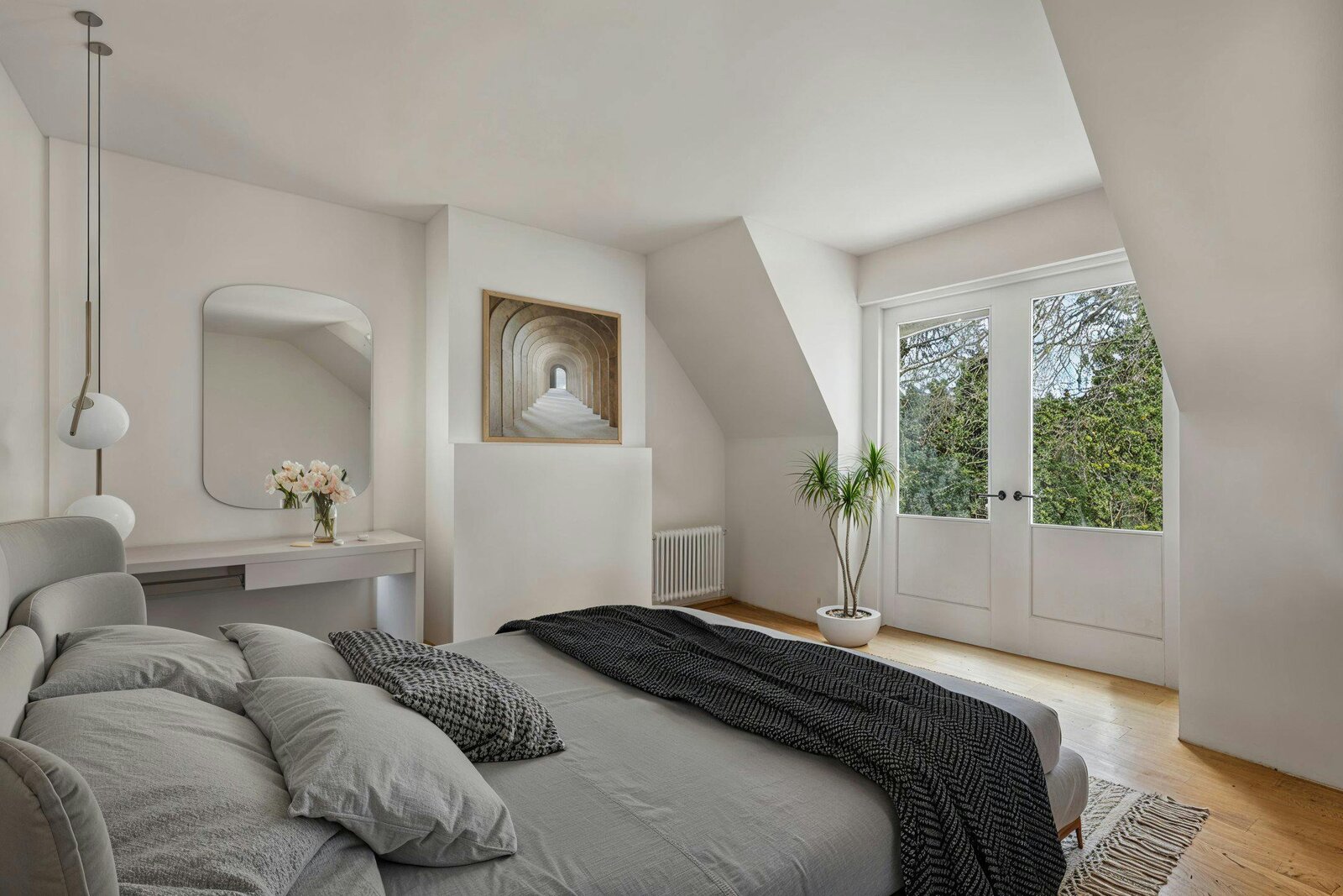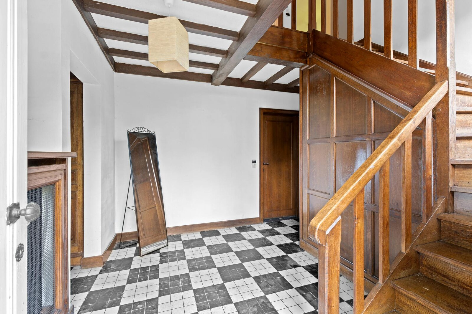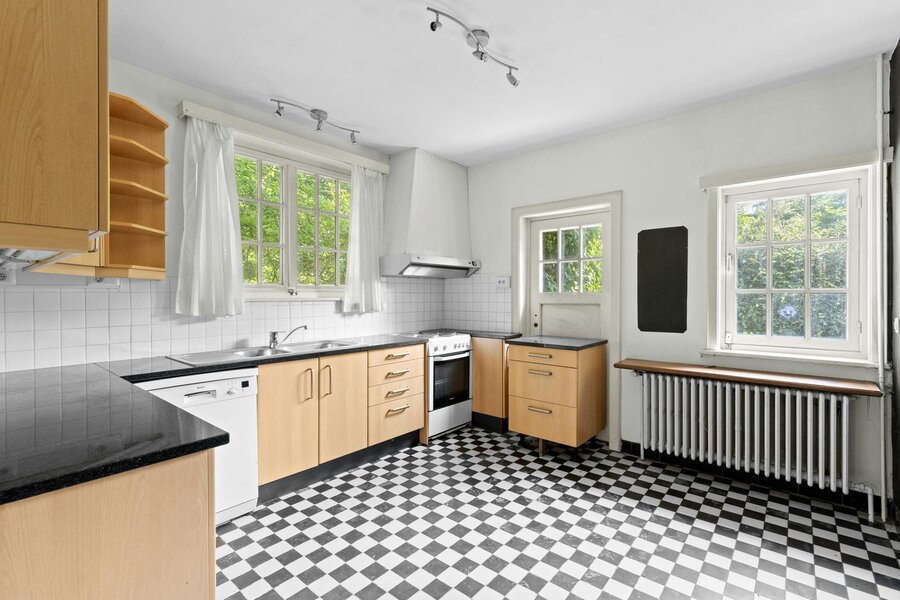 Dezelfde authentieke sfeer vindt u terug in de ruime leefkeuken, die even lichtrijk is en is uitgerust met een charmante zwart-witte tegelvloer. U kunt er kokkerellen, terwijl u geniet van een ontspannend uitzicht op groen.