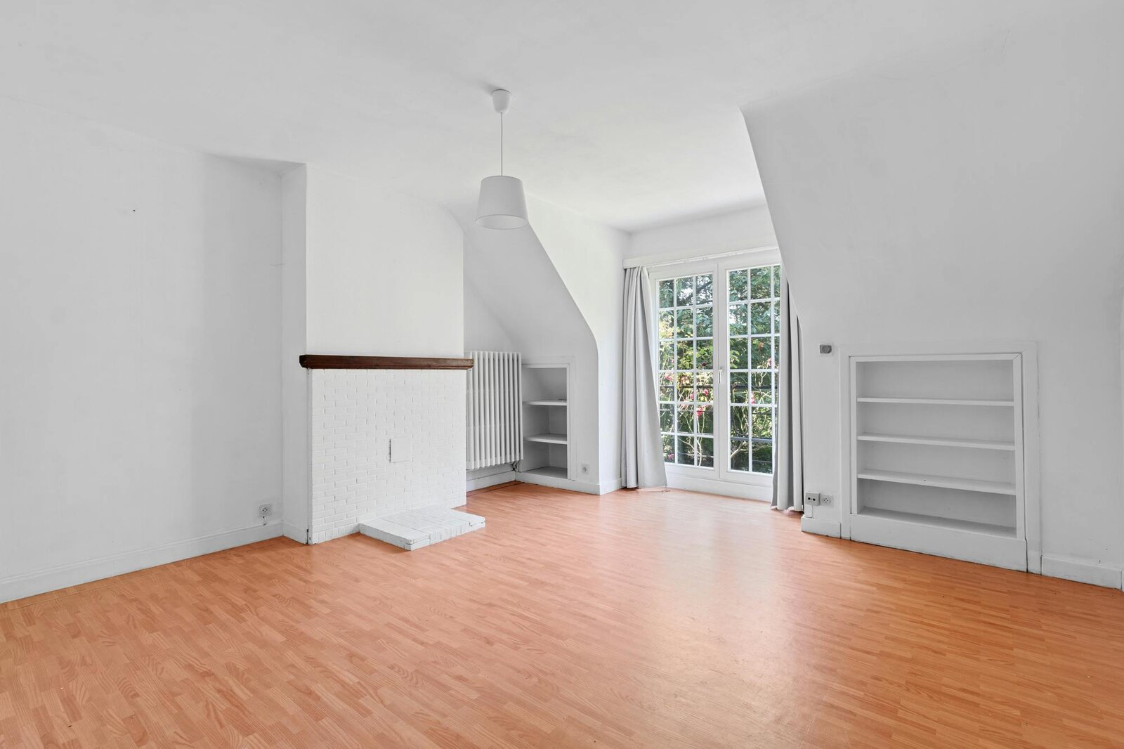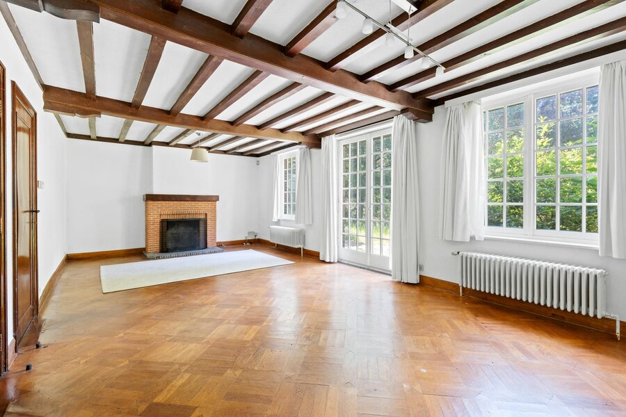 De charmante leefruimte creëert een knus en landelijk kader om in te ontspannen, met houten plafondbalken, een gezellige houthaard en zeeën van ruimte om zowel een eetruimte als salon in te richten. Meerdere glaspartijen en de dubbele deur die naar de achtertuin leidt, zorgen ervoor dat de gehele ruimte baadt in het natuurlijk licht.
