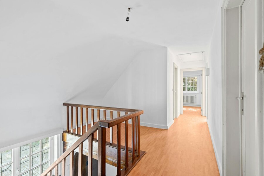 De nachthal op de eerste verdieping brengt u naar vier volwaardige slaapkamers, die elk zijn uitgerust met een warme houten vloer en ingemaakte opbergkasten of rekken. Elke kamer leent zich er tevens uitstekend toe om ingericht te worden als bureel, logeerkamer of ontspanningsruimte.