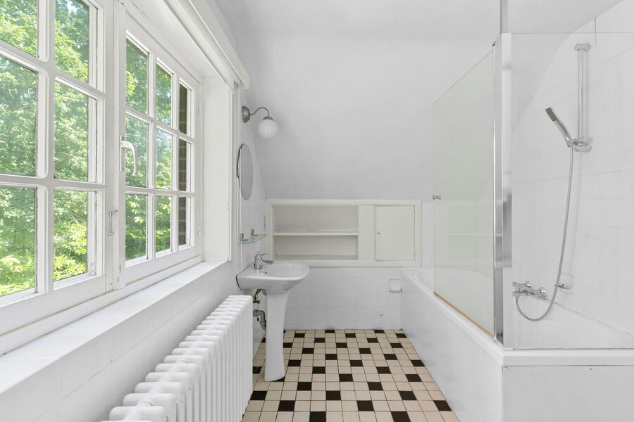De badkamer kan, mits grondige renovatiewerken, omgevormd worden tot een plek van wellness en ontspanning. De ruimte is op heden voorzien van een lavabo en een ligbad met douchevoorzieningen.