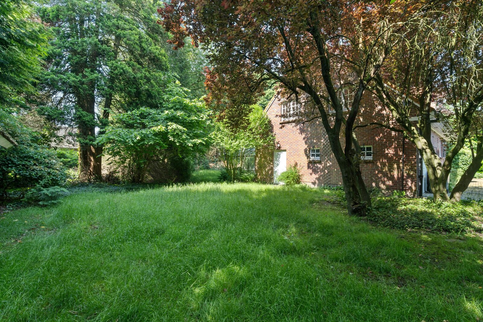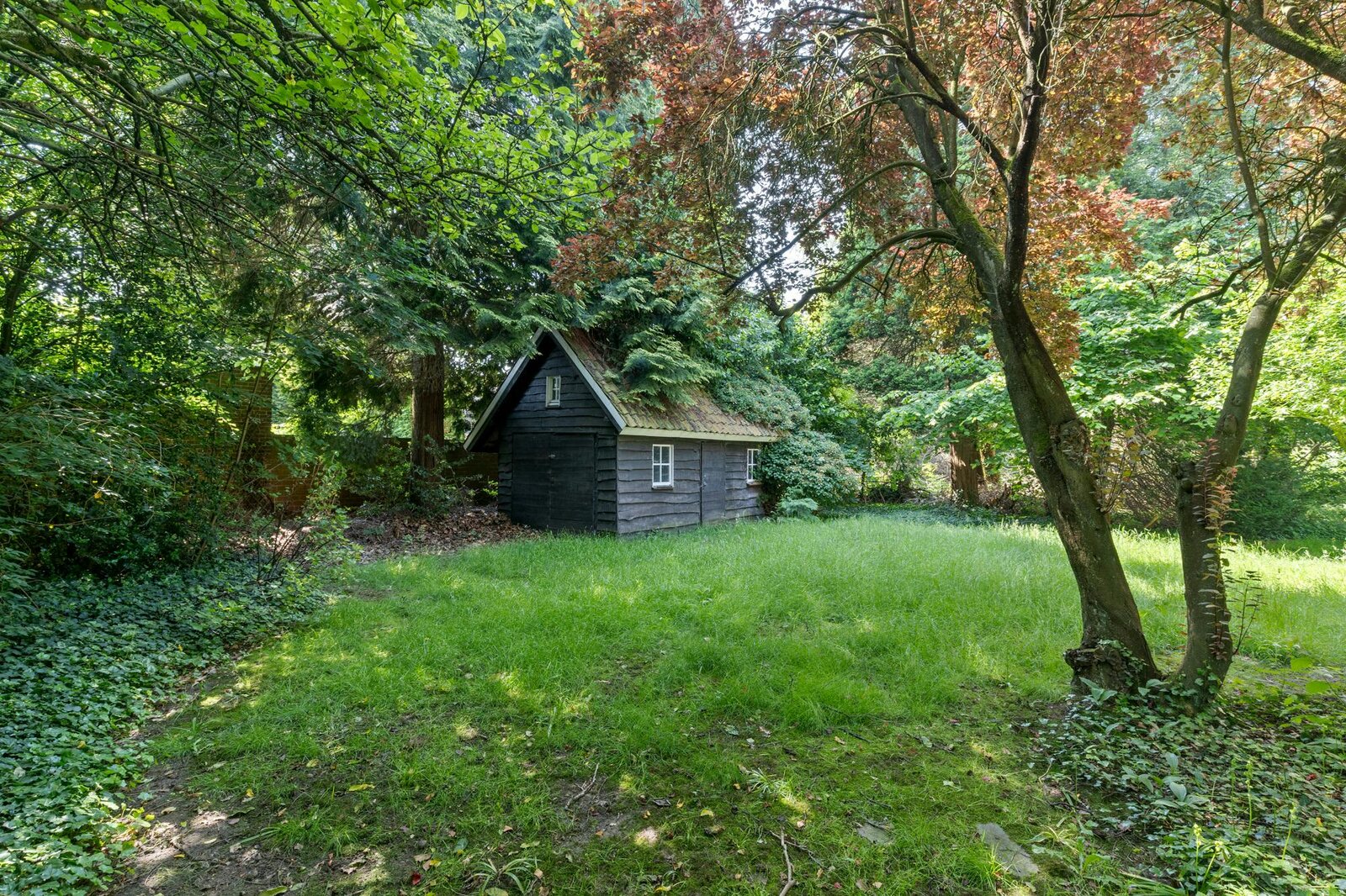 Het ruime perceel biedt plaats aan een idyllische oase van groen en een houten bijgebouw van 19,5 m².