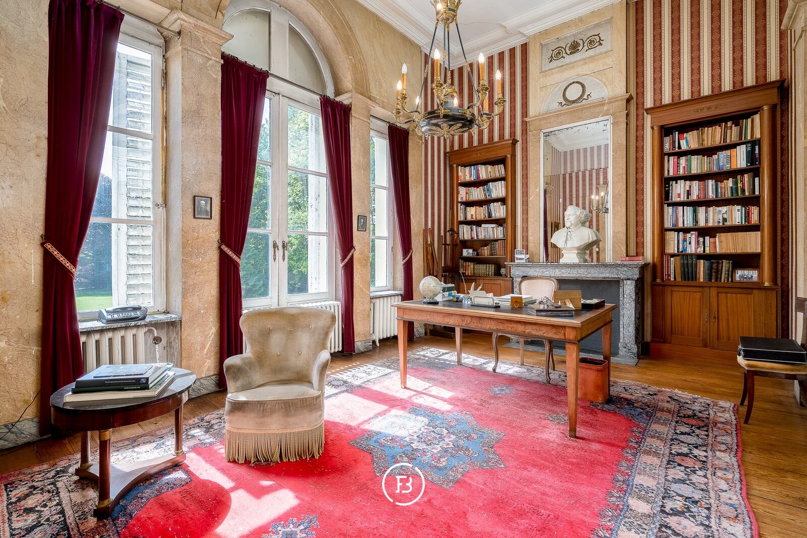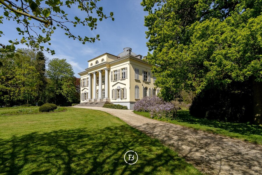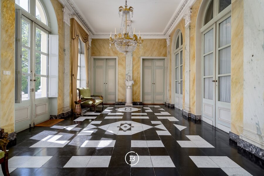 De rotonde met koepel is maar een van de vele verschillende authentieke elementen die het kasteel zijn nostalgische charme bezorgen. Oorspronkelijke elementen zoals de marmeren schouwen, karakteristieke parketvloeren en houten deuren katapulteren je twee eeuwen terug in de tijd. Naast inkom en rotonde omvat het gelijkvloers voorts nog het bureel, salon, eetkamer en keuken.