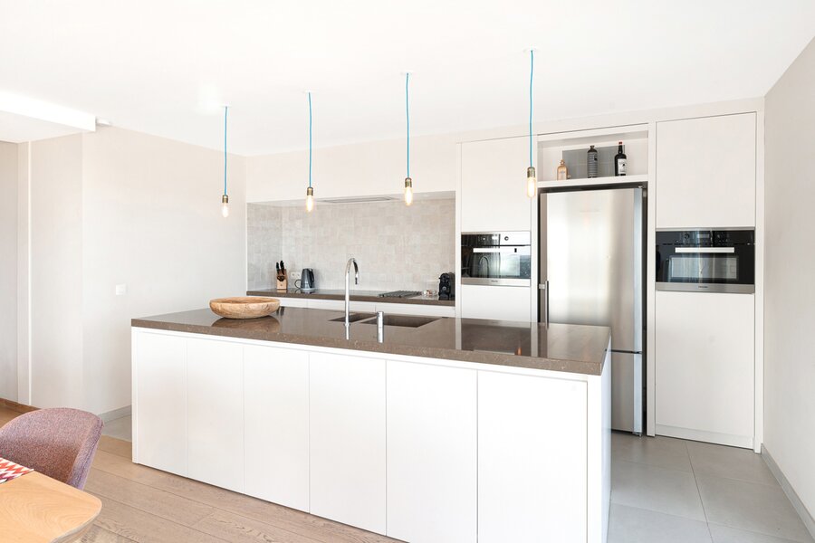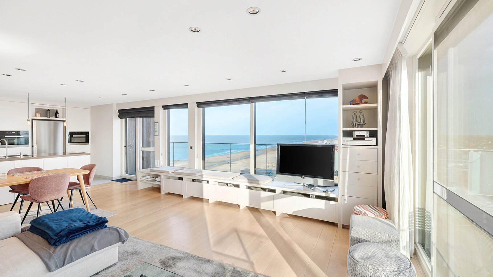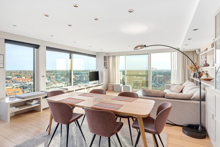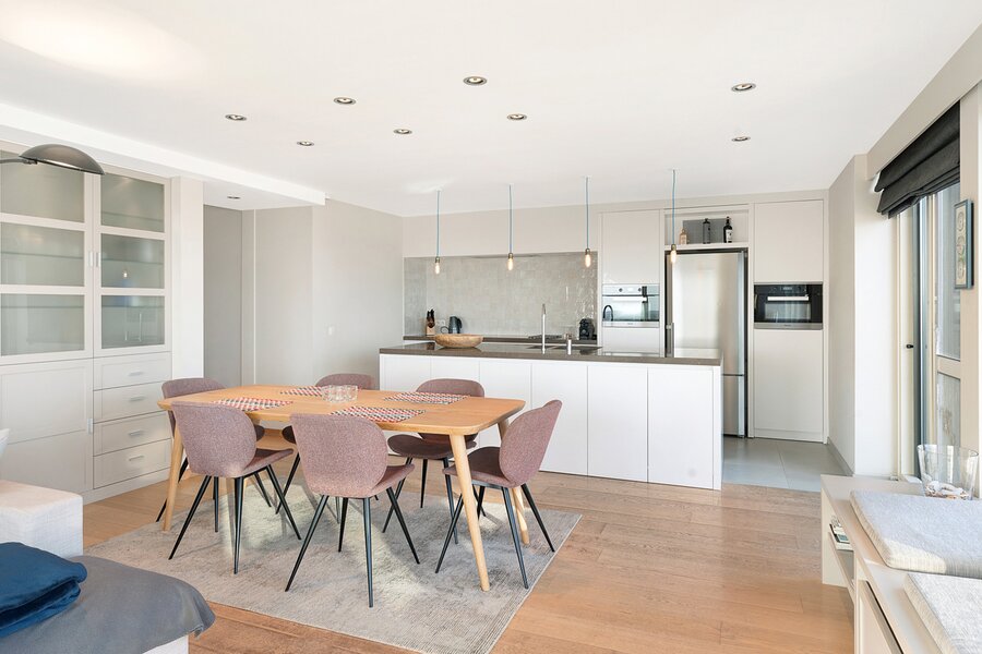 De ruime woonkamer met parketvloer biedt een adembenemend zicht op zee en over gans Knokke en leidt naar een royaal terras. De open keuken is voorzien van alle toestellen.