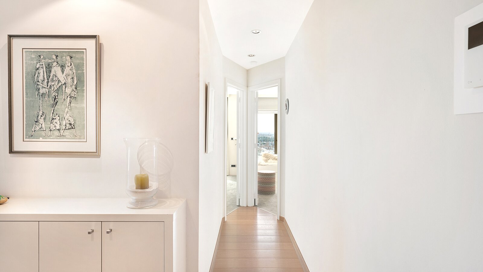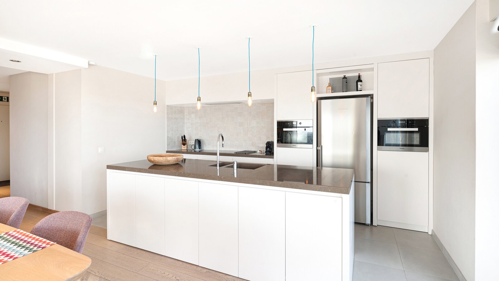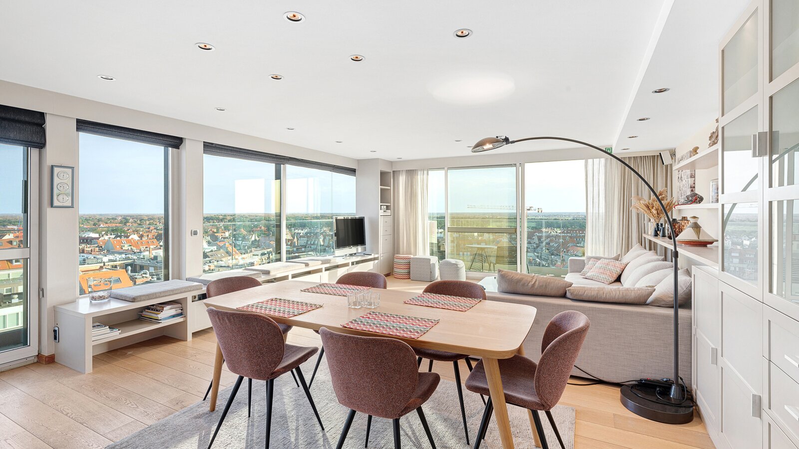De ruime woonkamer met parketvloer biedt een adembenemend zicht op zee en over gans Knokke en leidt naar een royaal terras. De open keuken is voorzien van alle toestellen.