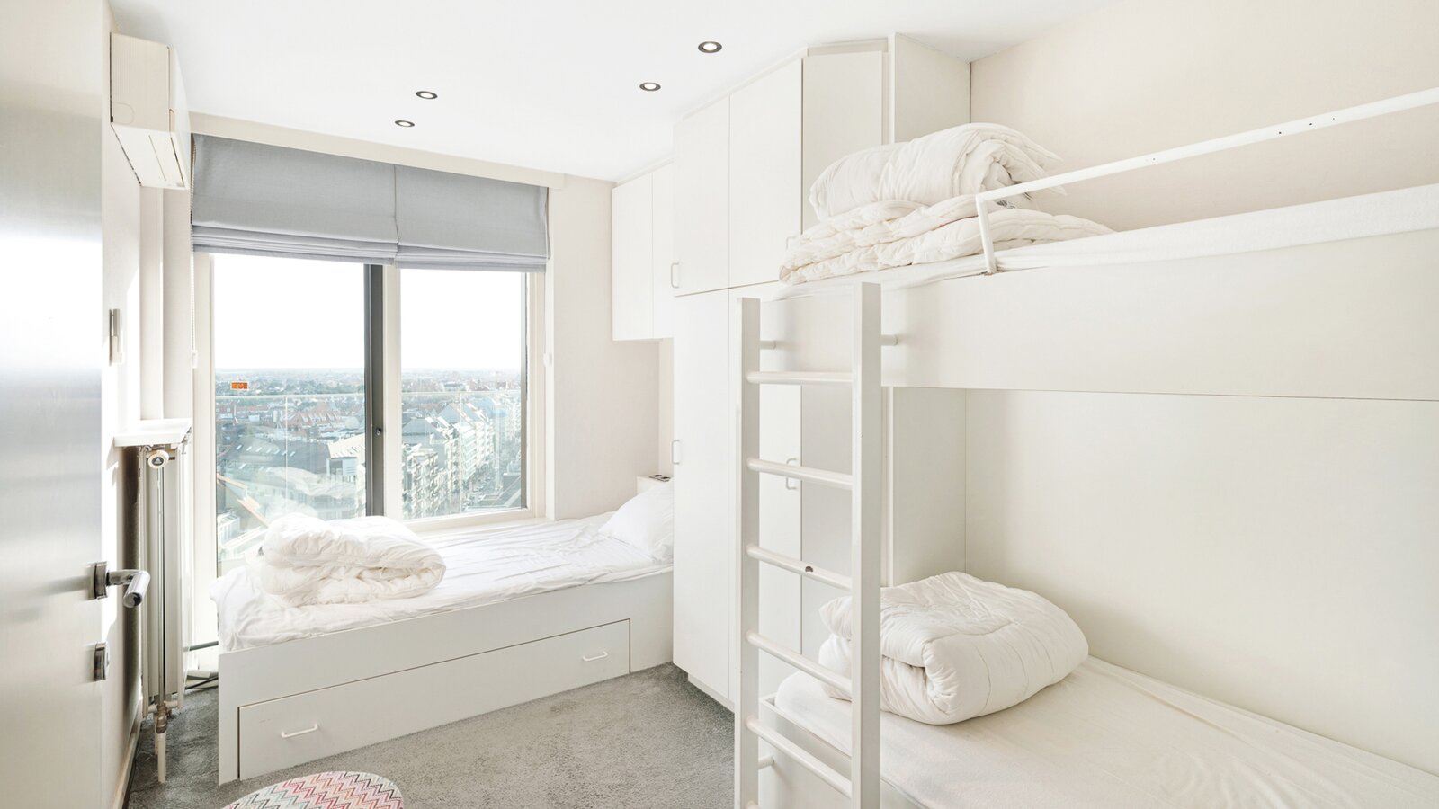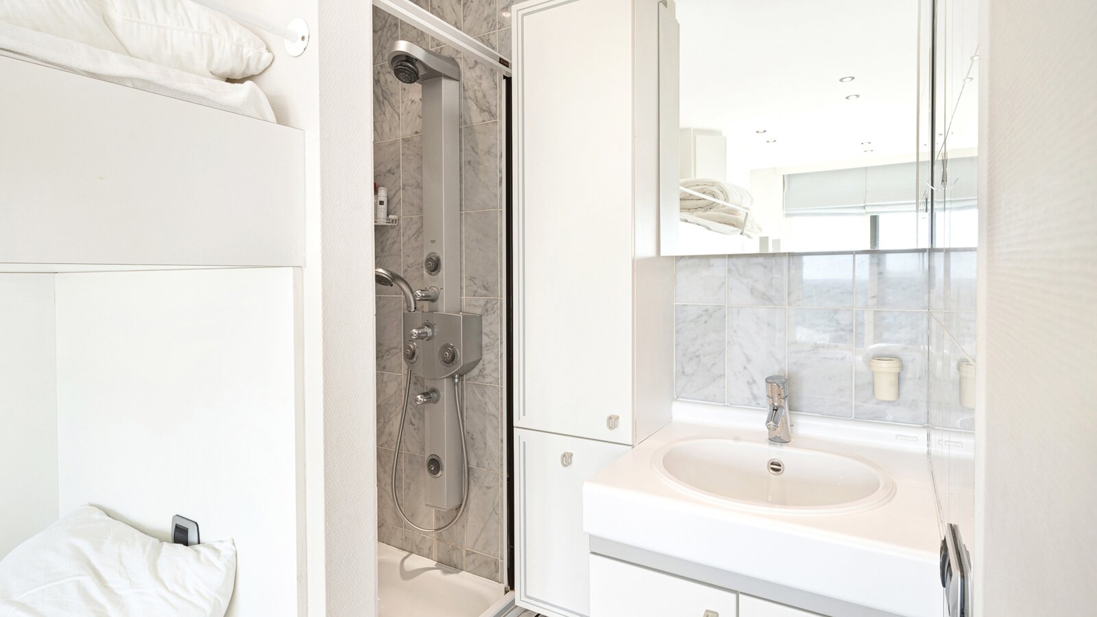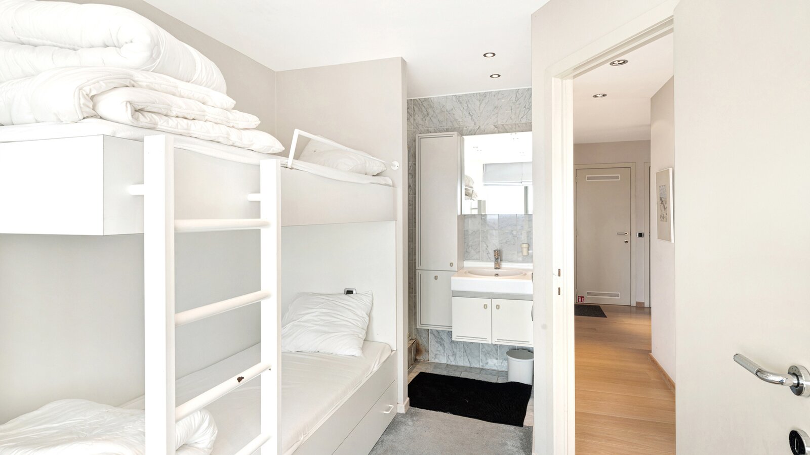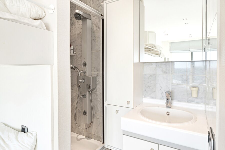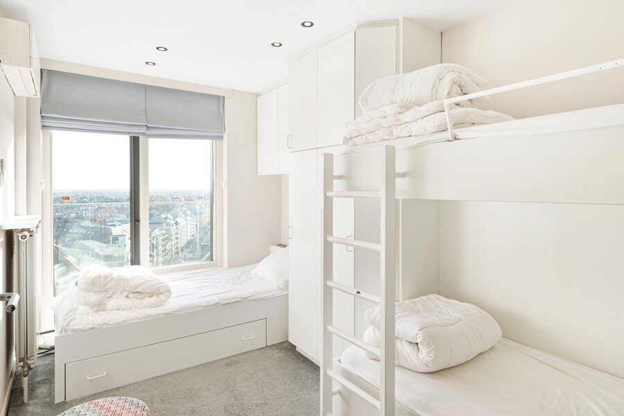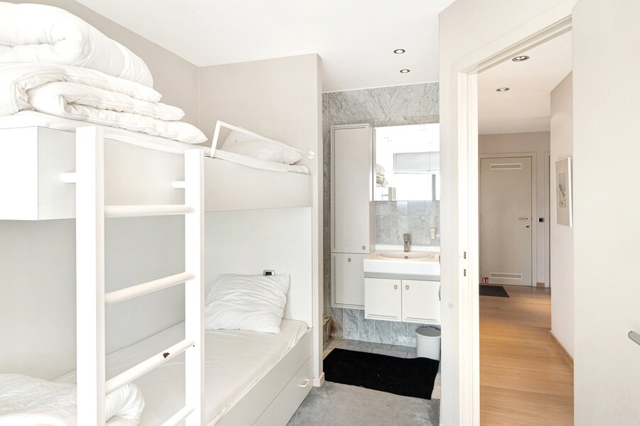 Masterbedroom met ingemaakte kasten en ensuite badkamer uitgevend op het zuidgericht terras. Slaapkamer 2 met stapelbed, enkel bed en douchekamer, mogelijkheid om stapelbedden weg te doen en te vervangen door een dubbel bed.
