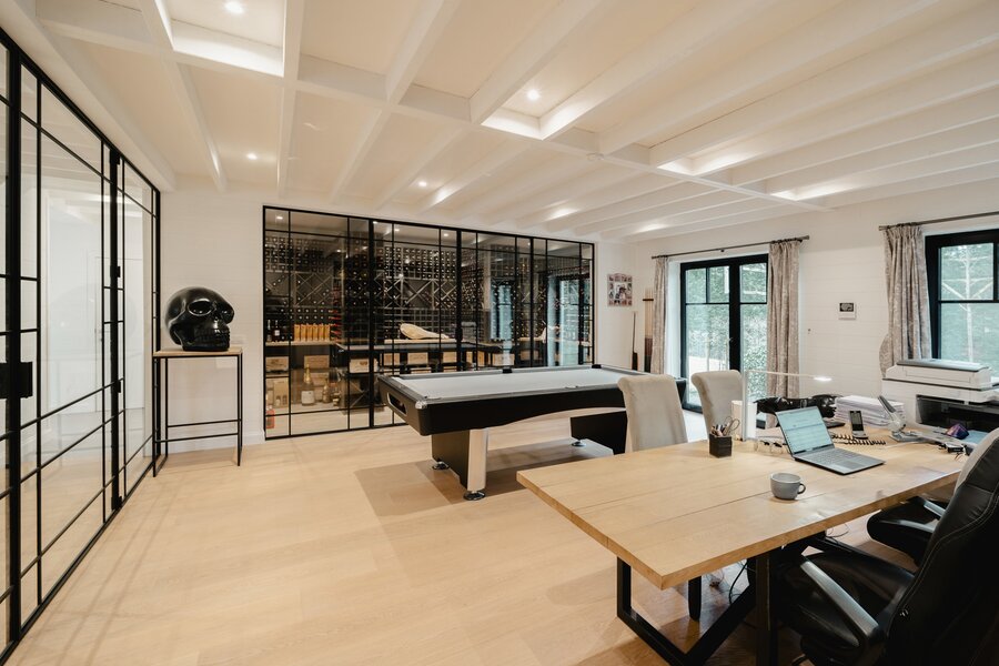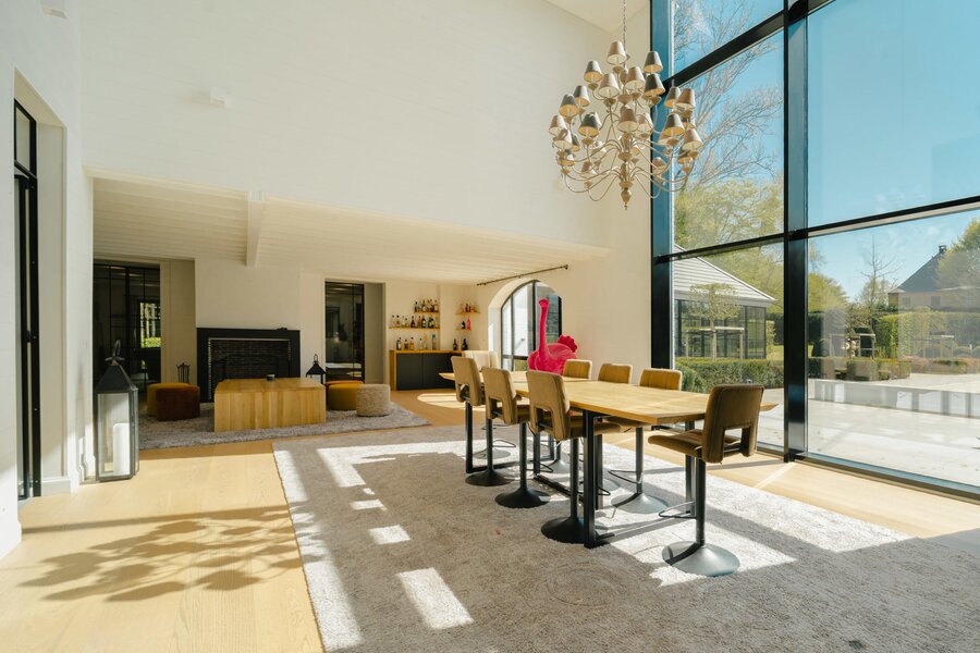 Bij de ingang beschikt de woning over een grote hal met vestiaire. Deze opent naar een ruime en lichte leefruimte met een eetkamer, een salon en een grote keuken. De begane grond omvat tevens een bureau met zicht op een glazen en geklimatiseerde wijnkelder, evenals een multifunctionele ruimte die momenteel is ingericht als ontspanningsruimte.