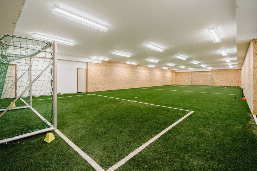 De kelder beschikt over een mini-voetbalveld met kleedkamers, een pétanqueterrein en een technische ruimte.
