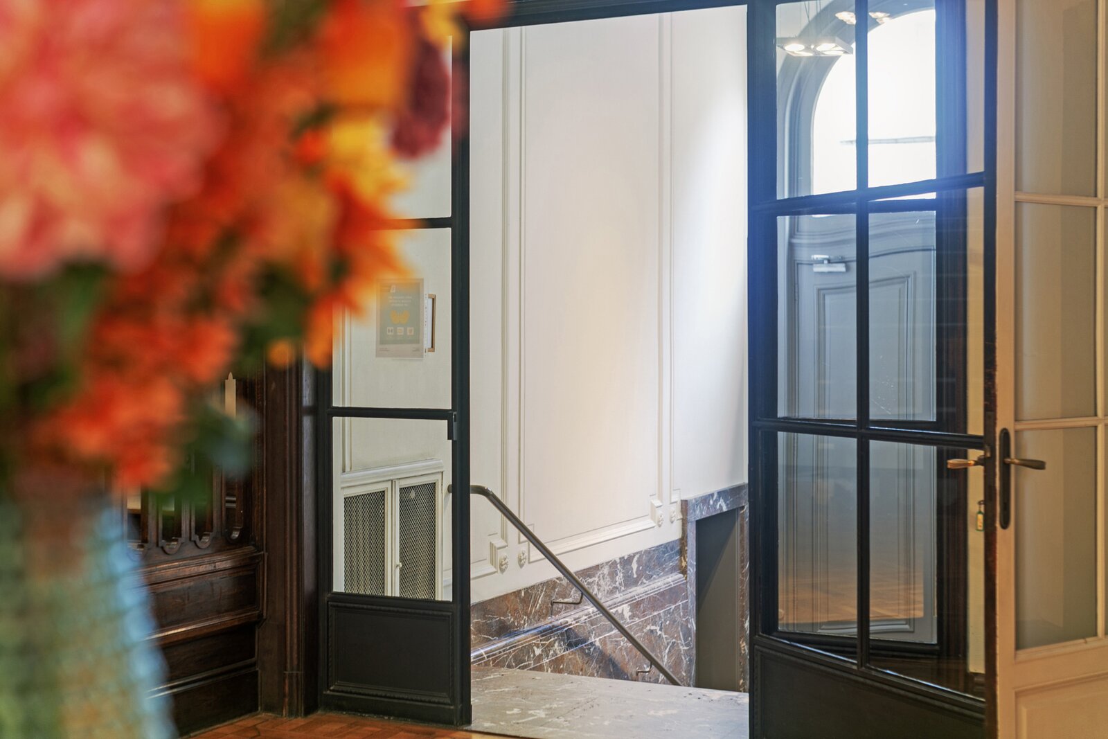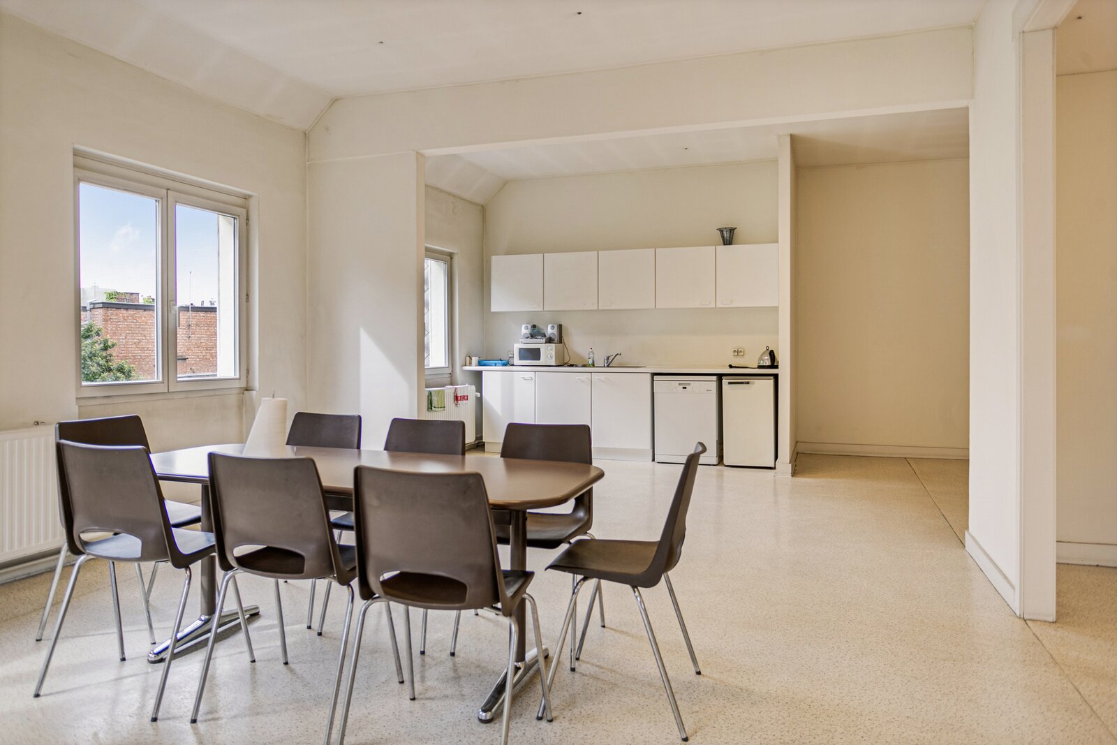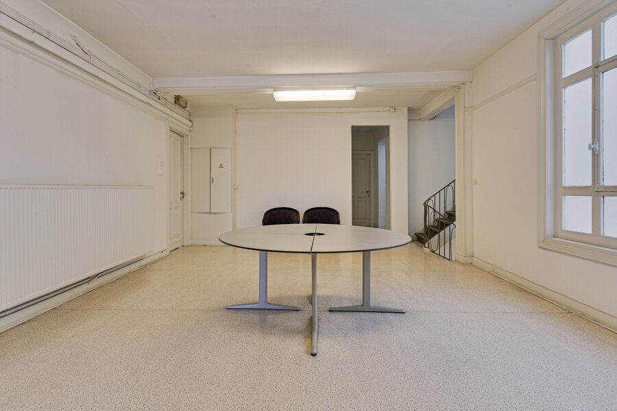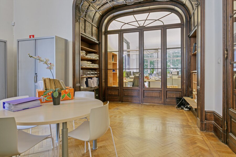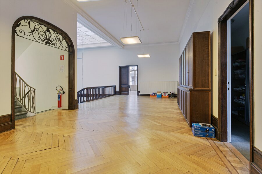 Vervolgens leidt de trap naar de verdiepingen die telkens onderverdeeld zijn in verschillende kantoren en voorzien van sanitair. Authentieke elementen werden behouden.