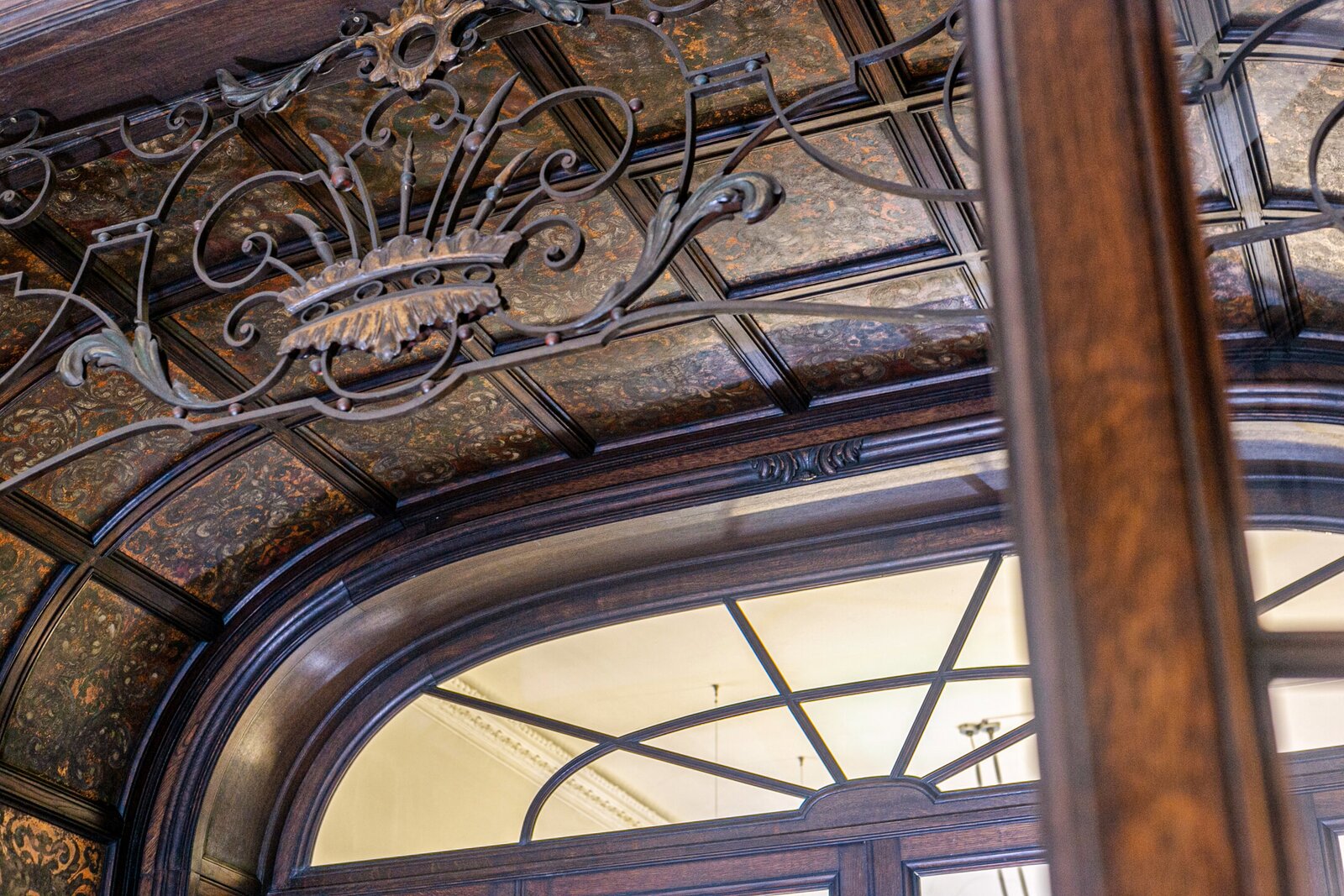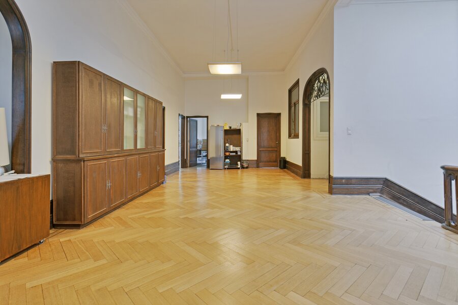 Dubbele houten deur geeft toegang tot het eigendom. Een centrale trapzaal met prachtige lichtinval via de lichtkoepel verbindt de verscheidene vertrekken. Het originele schrijnwerk in combinatie met parketvloeren en hoge plafonds geven authenticiteit en eigenheid. Twee ruime aaneensluitende kamers worden verbonden door een majestueuze openslaande deur met glazen invulling, voorzien van ijzeren smeedwerk en ingebouwde opberging. Grote raampartijen in de achterkamer bieden zicht op volgroeide bomen en toegang tot de buitenruimte.