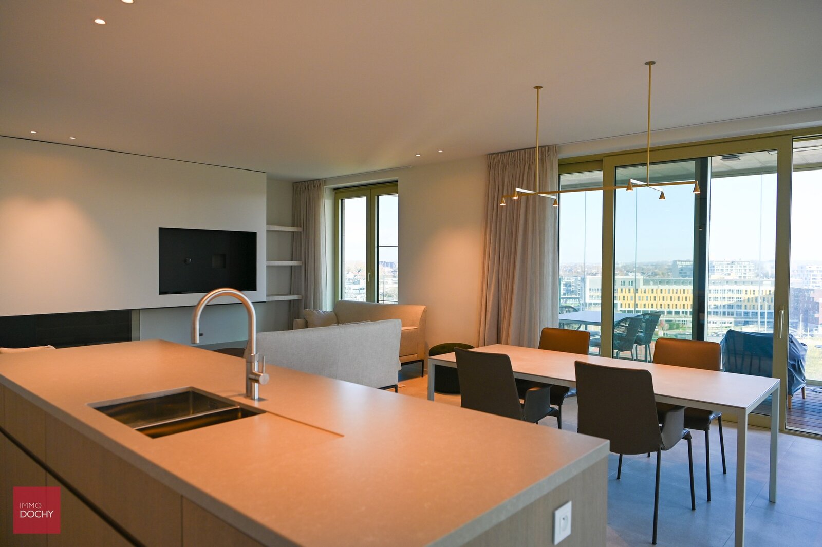Standingvol nieuw en volledig ingericht hoek-appartement op de 8ste verdieping. Fenomenale zichten. Hoogwaardige afwerking. Bestaande uit een inkomhall en vestiaire, living met gashaard, smaakvol ingerichte keuken, annex wasplaats, 2 slaapkamers, bureel / 3de slaapkamer, grote badkamer, grote terrassen en wintertuin. Ondergronds is er een mogelijkheid tot garagebox, autostandplaats. De kelderberging is inbegrepen. Airco / vloerverwarming / Wilfra-afwerking. Uniek. Bezoek is uiteraard vrijblijvend.