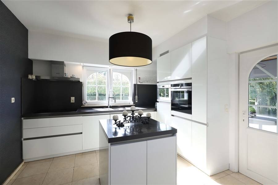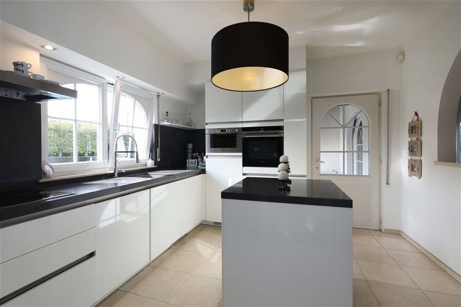 + Moderne ingerichte keuken met eiland, werkblad in zwarte marmer, voorzien van alle comfort