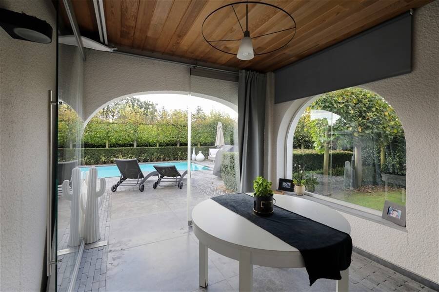 + Overdekte gezellige patio met glazen schuifwanden aan de voorzijde ,grenzend aan de keuken én directe connectie met terras en tuin