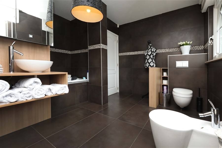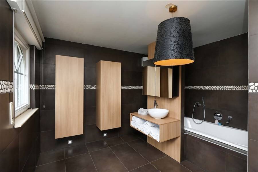 + Stijlvol ingerichte badkamer met een riant ligbad en airco installatie