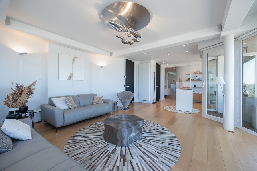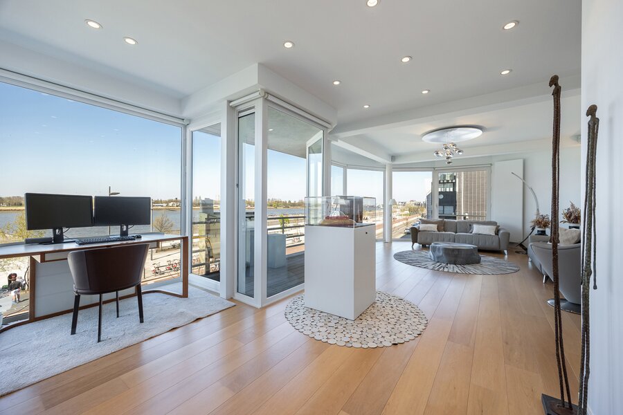Een uitzonderlijke breedte zorgt voor een panoramisch zicht vanuit de ruime en lichte leefruimte. Een geïnstalleerde Bulthaupt-keuken is voorzien van alledaags comfort.
