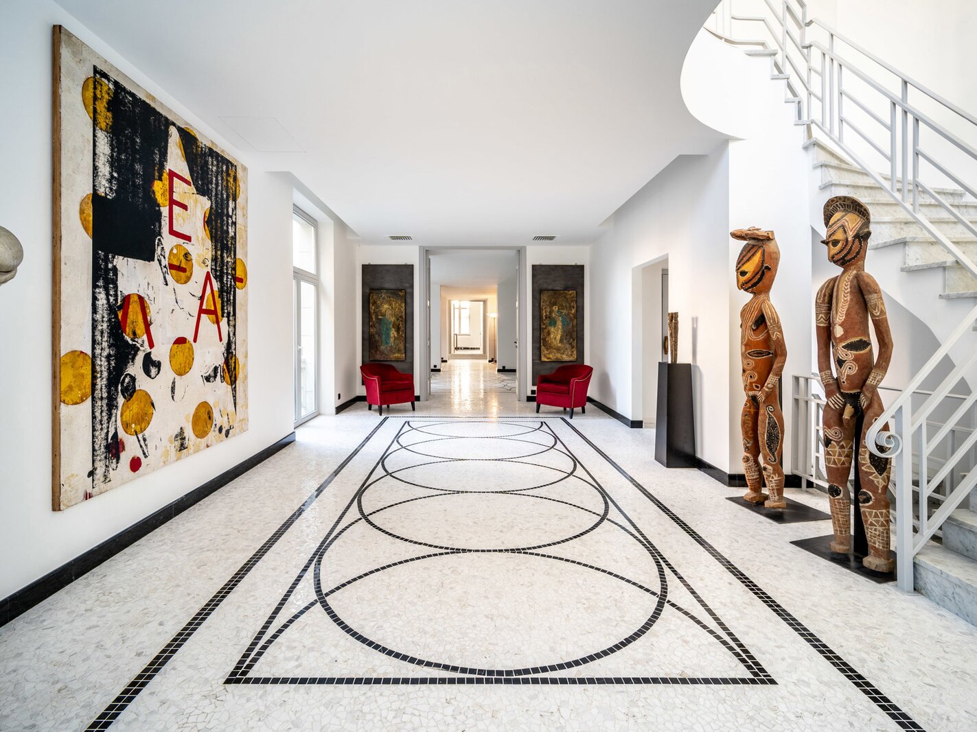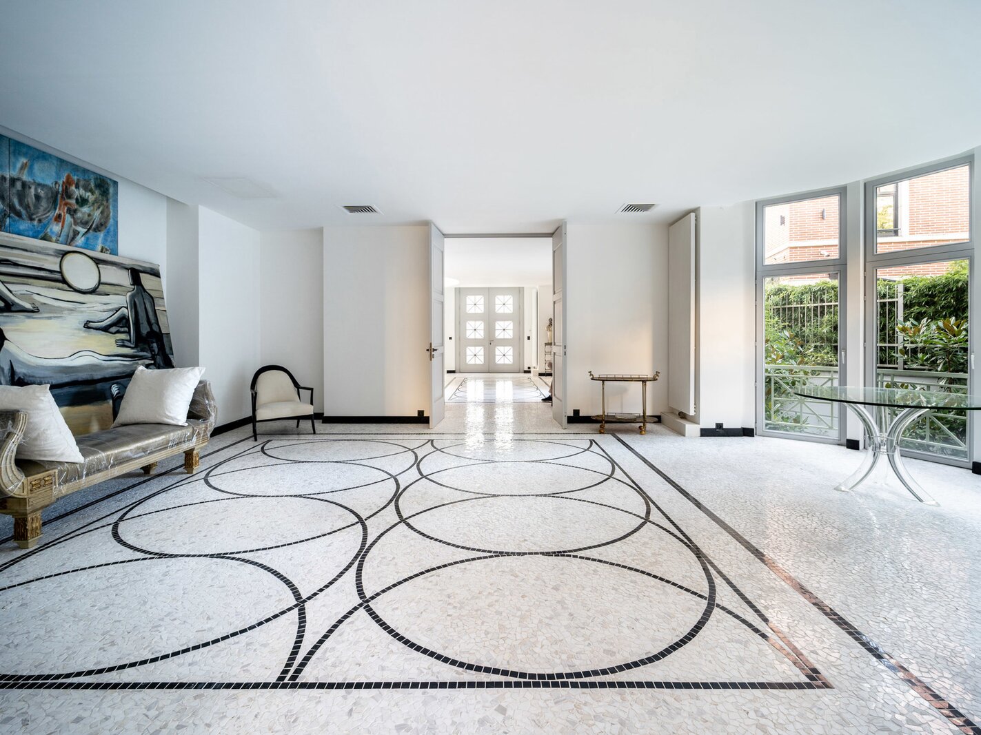 Op de begane grond bestaat het huis uit een ruime inkomhal, grote salons en een mooie eetkeuken met open haard. De 1e verdieping heeft een nachthal met bibliotheek en een grote slaapkamer met kleedkamer en complete badkamer. De 2e verdieping biedt twee grote slaapkamers, elk met een eigen badkamer. Het slaapgedeelte wordt op de 3e verdieping gecompleteerd door twee slaapkamers, ook met een eigen badkamer. De 1e sous-sol herbergt een serviceflat en 2 garages. De tweede sous-sol beschikt over een groot zwembad met daglicht, een sauna en een hammam.